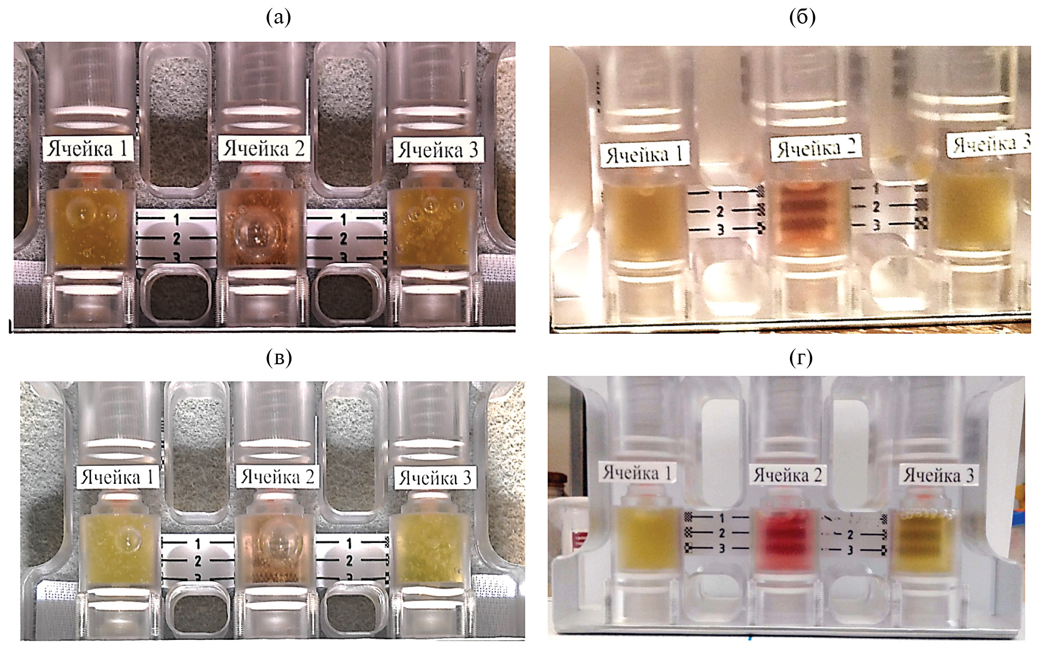 Рис. 2. Фотографии кассет НА “Микровир” сразу после перемещения содержимого верхних ячеек в нижние в КЭ (а) и НЭ (б). Фотографии кассет НА “Микровир” после завершения лизиса клеток в КЭ (в) и НЭ (г).