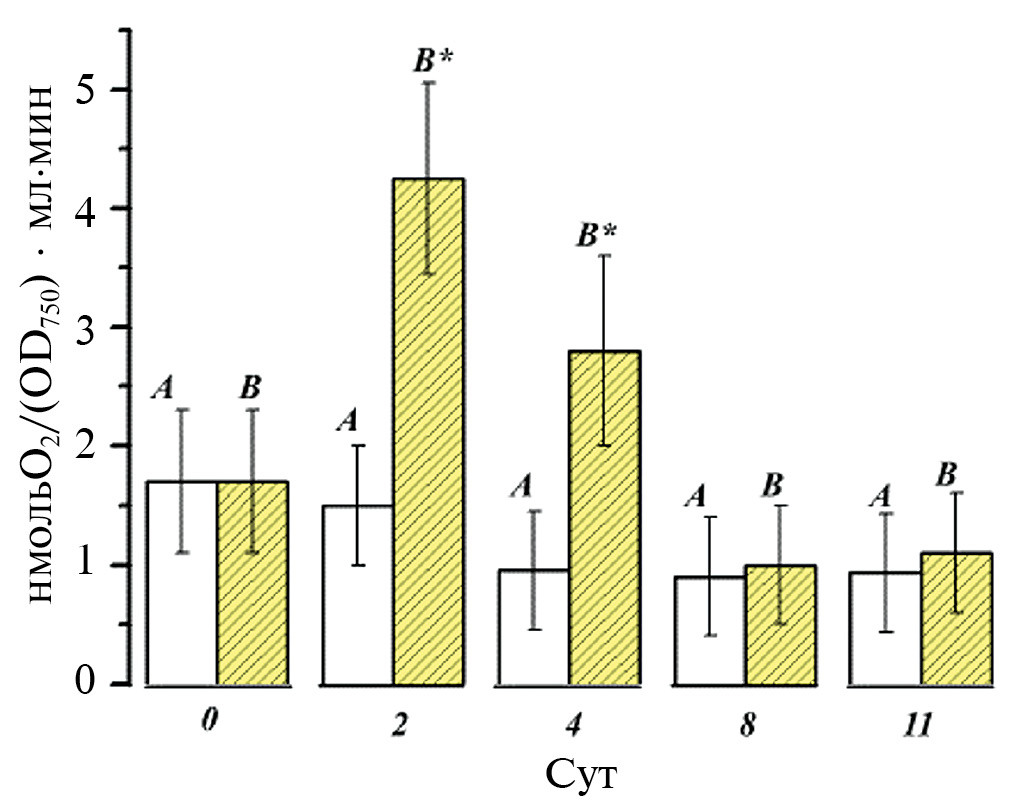 Рис. 2. Изменение скорости поглощения кислорода при темновом дыхании клеток G. sulphuraria, находящихся в темноте без добавления (А) и с добавлением 0.1% этанола (В). * Обозначены статистически значимые различия (см. Методы).