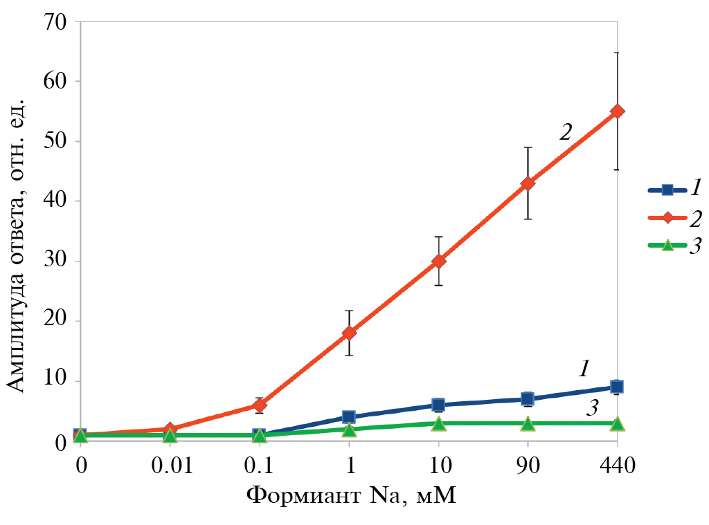 Рис. 3. Зависимость максимального ответа (АО) штаммов А1, В26 и В29 от различных концентраций формиата натрия. 1 ‒ А1, 2 ‒ В26, 3 ‒ В29.