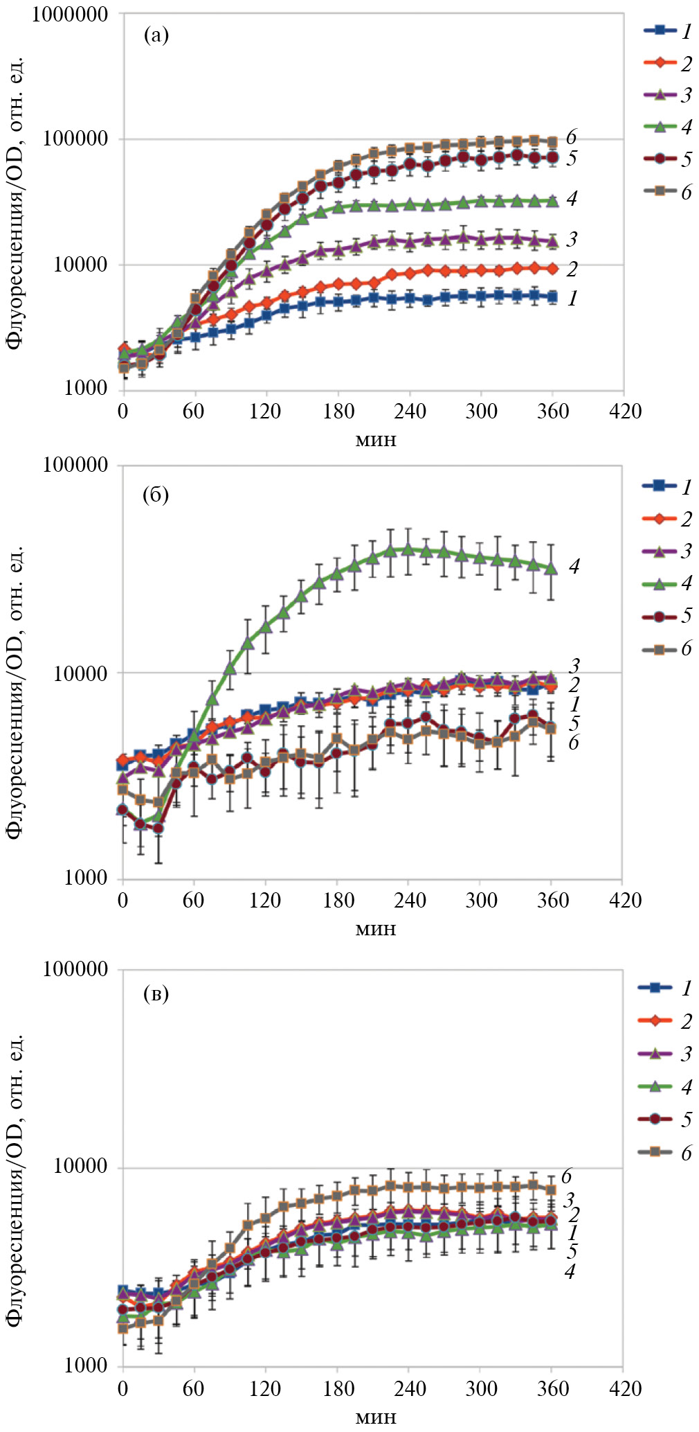 Рис. 5. Зависимость нормализованной по оптической плотности (OD) флуоресценции биосенсора В26 от времени инкубации в питательной среде, содержащей маннит (1%) и формиат натрия (а), формальдегид (б) или метанол (в) в концентрациях: 1 ‒ без добавления, 2 ‒ 10 мкМ, 3 ‒ 100 мкМ, 4 ‒ 1 мМ, 5 ‒ 10 мМ, 6 ‒ 100 мМ.