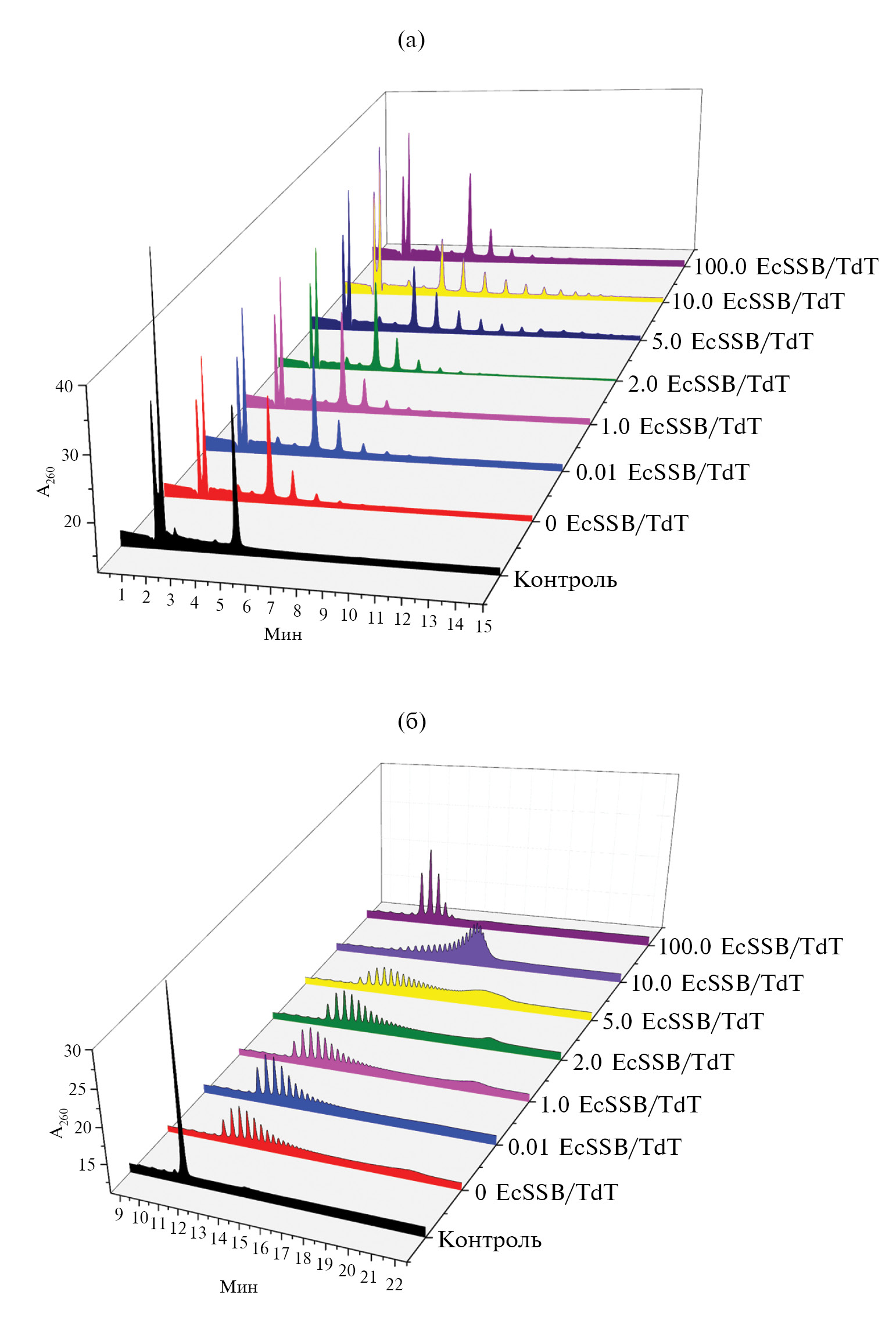 Внесение даже минимального количества белка EcSSB (1/100 от количества TdT) в реакционную смесь приводило к увеличению количества и смещению продуктов реакции в сторону более протяженных олигонуклеотидов, а значит и увеличению процессивности фермента (рис. 7а, б). Изменение стехиометрических соотношений EcSSB/TdT, в диапазоне от 0 до 10, приводило к увеличению активности TdT (табл. 2), а на хроматограммах ясно просматривался переход с дистрибутивного механизма на процессивный (рис. 7а, б). При значениях соотношения в диапазоне 10–100, активность TdT начинала снижаться, но не блокироваться.