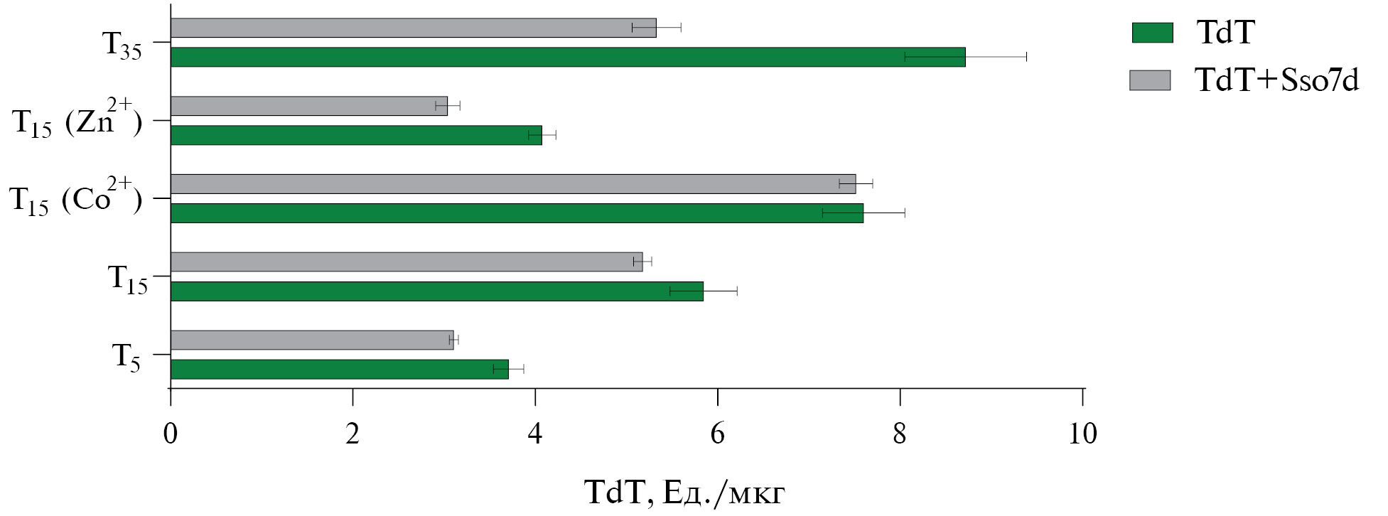 Исследование олигонуклеотидных субстратов T5, T15, T35 в реакции продемонстрировало, что активность TdT возрастала с увеличением протяженности олигонуклеотида (рис. 11). Полученные результаты согласовывались с данными, полученными для серии олигонуклеотидов dAn (n = 4–50) [9]. Кинетический анализ подтвердил, что при возрастании олигонуклеотидной цепи dAn от 4 до 50, KM уменьшалось от 160 до 1 мкМ [9]. Для субстрата T15 присутствие катионов Co2+ оказывало активирующее влияние, а катионы Zn2+, напротив, снижали активность TdT. Во всех случаях присутствие в системе Sso7d приводило к снижению активности TdT.