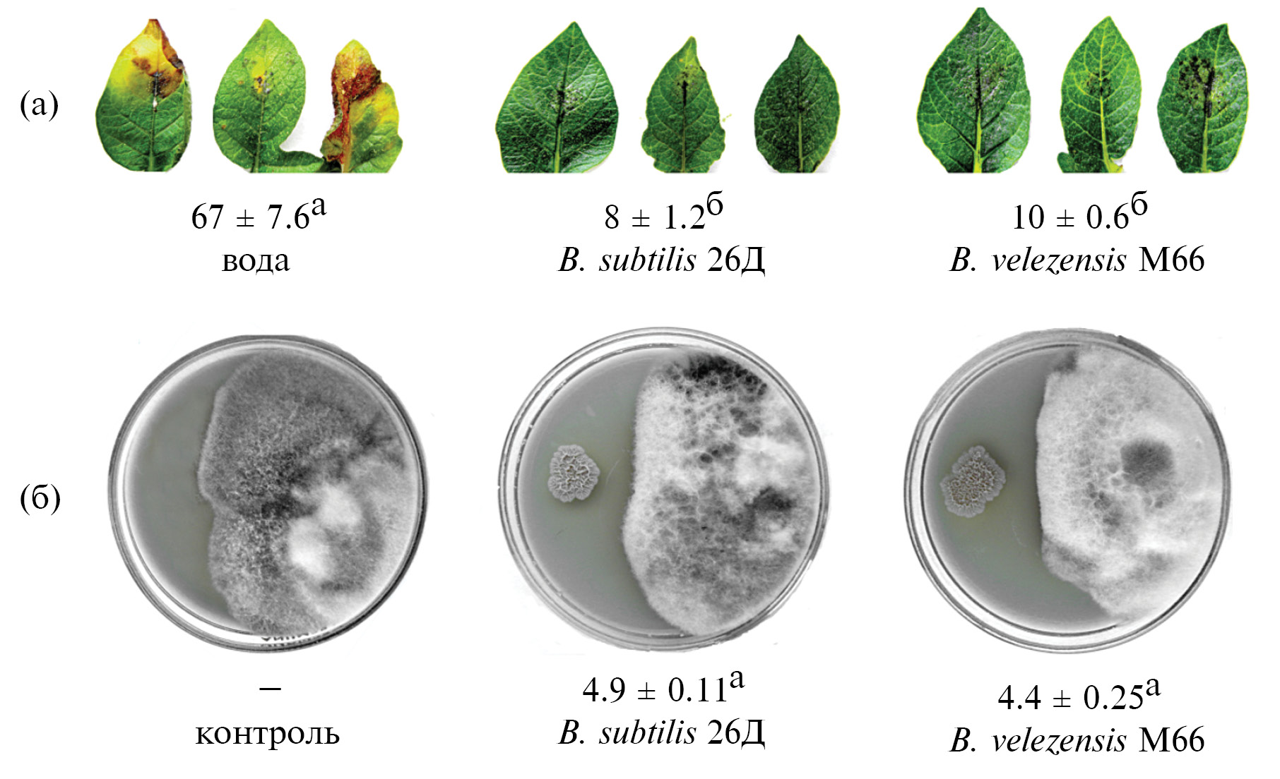 Рис. 1. Площадь проявления симптомов альтернариоза (а) на листьях картофеля в контроле и под влиянием B. subtilis 26Д и B. velezensis M66 (цифрами показан % пораженной площади листовой пластинки), и подавление роста культуры гриба A. solani (б) исследуемыми штаммами (цифрами показано расстояние между колониями бактерии и гриба). Разными буквами обозначены статистически значимые отличия показателей (при p ≤ 0.05).