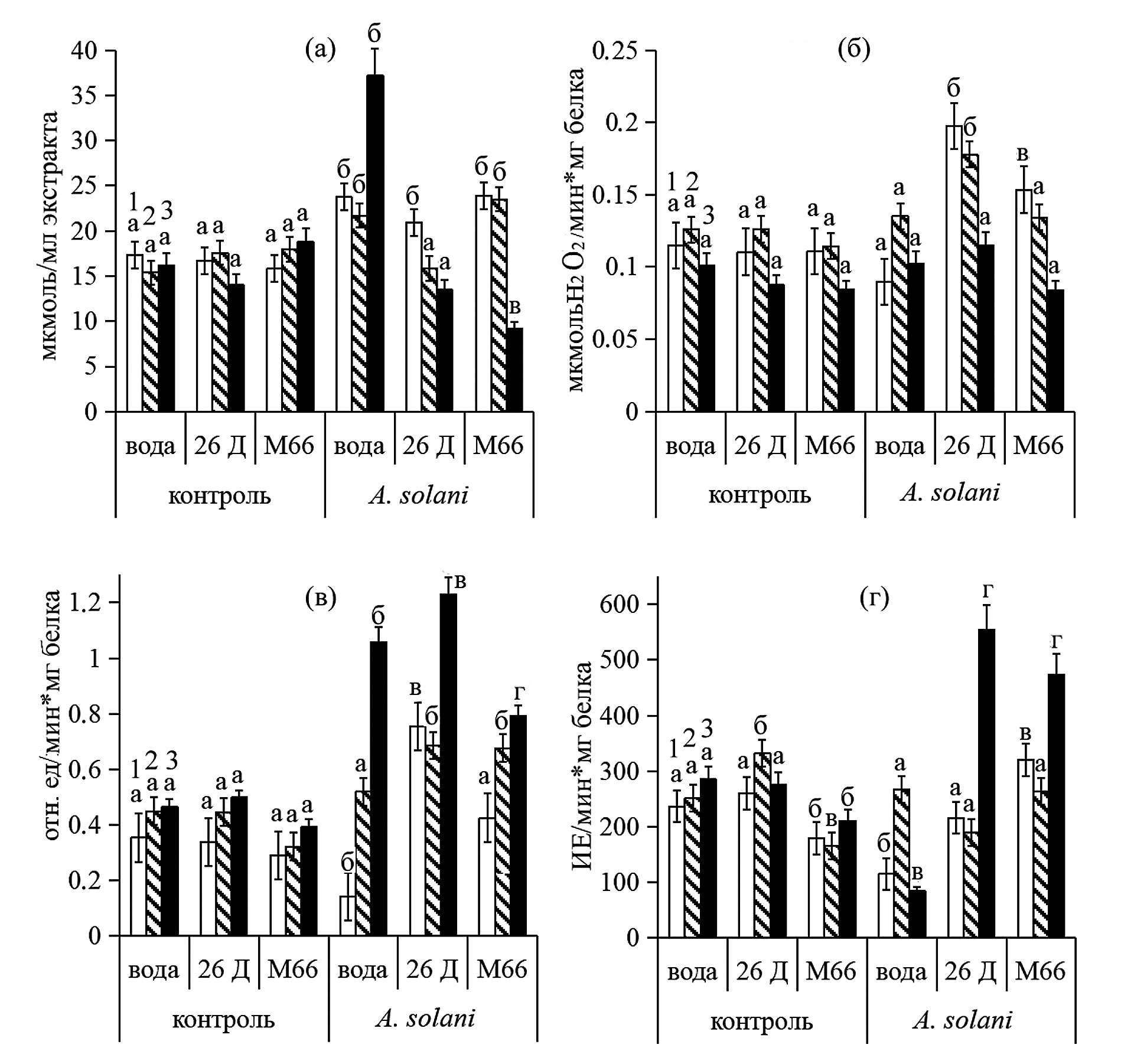Рис. 3. Влияние бактерий B. subtilis 26Д и B. velezensis M66 на содержание пероксида водорода (а), активность каталазы (б), пероксидаз (в) и ингибиторов трипсина (г) в здоровых и инфицированных возбудителем альтернариоза растениях картофеля: 1 – 1 ч, 2– 24 ч, 3 – 6 сут после нанесения спор патогена. Разными буквами обозначены статистически значимые отличия показателей, наблюдаемых в соответствующей временной точке (при p ≤ 0.05).