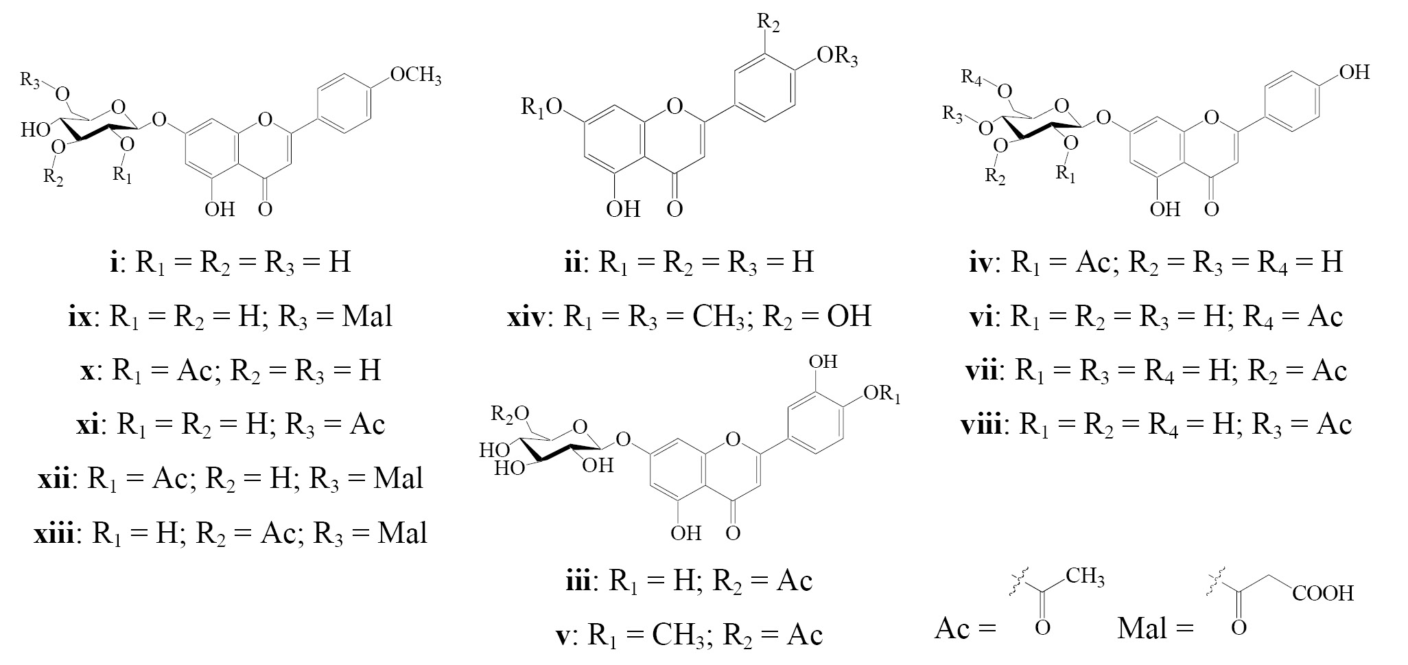 Для определения биологически активных компонентов цветков A. foenicilum изопропанольный экстракт (2.64 кг) предварительно обезжиривали хлороформом, после чего фракционировали на полиамиде, что позволило получить фракции, в которых сконцентрированы нефенольные гидрофильные компоненты (фракция ТФЭ-1, 810 г), неацилированные фенольные соединения (фракция ТФЭ-2, 550 г) и фенольные кислоты и ацилированные флавоноиды (фракция ТФЭ-3, 570 г). Фракции, содержание фенольные компоненты подвергали хроматографическому разделению на Сефадексе LH-20, обращено- и нормально-фазовом силикагеле, и очистке с применением ПВЭЖХ. В результате были выделены флавоноиды i–xiv – акацетин 7-О-глюкозид (25 г; i) и акацетин (7 г; ii), лютеолин 7-О-(6''-О-ацетил)-глюкозид (10 мг; iii), апигенин 7-О-(2''-О-ацетил)-глюкозид (25 мг; iv), диосметин 7-О-(6''-О-ацетил)-глюкозид (7.5 г; v), апигенин 7-О-(6''-О-ацетил)-глюкозид (18 г; vi), апигенин 7-О-(3''-О-ацетил)-глюкозид (30 мг; vii), апигенин 7-О-(4''-О-ацетил)-глюкозид (45 мг; viii), акацетин 7-О-(6''-О-малонил)-глюкозид (21 г; ix), акацетин 7-О-(2''-О-ацетил)-глюкозид (40 мг; x), акацетин 7-О-(6''-О-ацетил)-глюкозид (20 г; xi), акацетин 7-О-(2''-О-ацетил-6''-О-малонил)-глюкозид (125 г; xii), акацетин 7-О-(3''-О-ацетил-6''-О-малонил)-глюкозид (1 г; xiii) и лютеолин 7,4'-диметиловый эфир (520 мг; xiv) (рис. 1), а также 6 новых соединений – I (220 г), II (50 мг), III (3.5 г), IV (35 мг), V (5 г) и VI (14 г), идентифицированные по данным спектроскопии УФ, масс-спектрометрии (табл. 1) и ЯМР 1Н (табл. 2) и 13С (табл. 3) [15, 16].