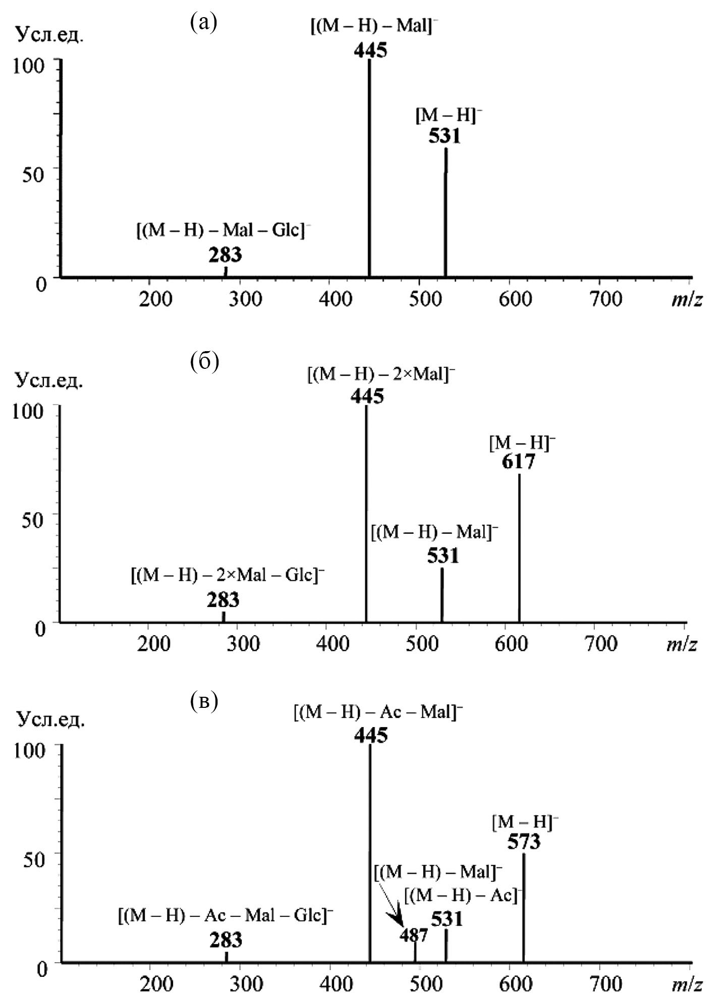 ESI-MS, m/z (%) | 617 (70) [M–Н]–, 531 (20) [(M–Н)–малонил]–, 445 (100) [(M–Н) –2×малонил]–, 283 (5) [(M–Н)–2×малонил–глюкоза]– | |