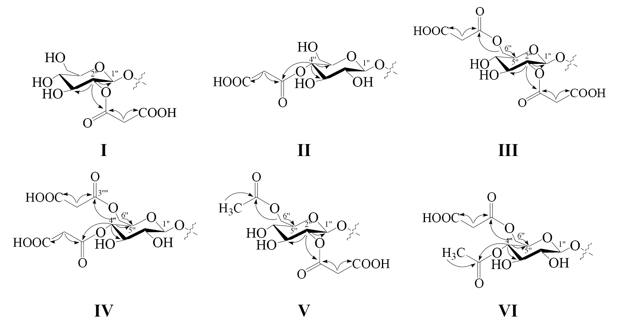 Локализацию ацильных групп определяли по данным одно- и двумерной спектроскопии ЯМР (табл. 2, 3, рис. 3). Сравнительный анализ спектров тилианина и I выявил наличие сдвига в слабое поле сигнала С-2'' глюкозы (δС 72.8 → 72.5) и сильнопольные сдвиги сигналов соседних атомов С-1'' (δС 100.2 → 96.8) и С-3'' (δС 77.3 → 73.8) [15]. В спектре HMBC выявлены корреляции между сигналами Н-2'' (δН 4.89) и малонильным карбонилом (δС 168.2), что указывало на наличие замещения по положению С-2'' глюкозы и позволило описать строение I, как акацетин 7-О-(2''-О-малонил)-β-D-глюкопиранозида. У флавона II отмечены сдвиги в слабое поле сигнала С-4'' глюкозы (δС 70.2 → 72.7), а в спектре HMBC присутствовали корреляции между Н-4'' (δН 4.73) и малонильным карбонилом (δС 168.0), что возможно для акацетин 7-О-(4''-О-малонил)-β-D-глюкопиранозида. Ранее имелись сведения только об одном малонате тилианина – акацетин 7-О-(6''-О-малонил)-глюкозиде, выделенном из травы A. rugosa полностью [15].