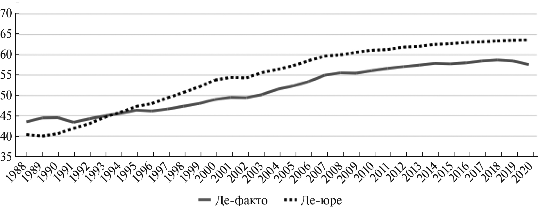 Современные экономисты [Intscher 2020; Yonson, Noy 2018; Aiyar, Chen, Ebeke, Garcia-Saltos, Gudmundsson, Ilyina, Kangur, Rodriguez, Ruta, Schulze, Trevino, Kunaratskul, Soderberg 2023] ввели термин «геоэкономическая фрагментация», чтобы описывать глобальную дезинтеграцию. На данном этапе усиливается влияние политических факторов и растет значимость межгосударственных отношений для развития мирового хозяйства. Геоэкономическая фрагментация – тенденция, противоположная глобализации, темпы которой замедлились в последние годы. С 1988 г. и до глобального кризиса 2008 г. мировой экспорт показывал стабильный рост от 785 до 17 701 трлн долл. США, в среднем 17,5% ежегодно. Однако за период с 2009 по 2020 гг. он возрос с 13 856 (падение по сравнению с 2008 г.) до 19 307 трлн долл., или на 1,4% ежегодно2. Аналогичная динамика характерна и для международных потоков ПИИ. За 1988–2008 гг. их объем увеличился со 182 до 1715 млрд долл. В 2009 г. показатель снизился до 1185 млрд долл. До сих пор он не превысил уровень 2008 г. (780 млрд долл. в 2020 г.3). На рис. 1 показано изменение индекса глобализации КОФ, который рассчитывают эксперты Швейцарского экономического института.