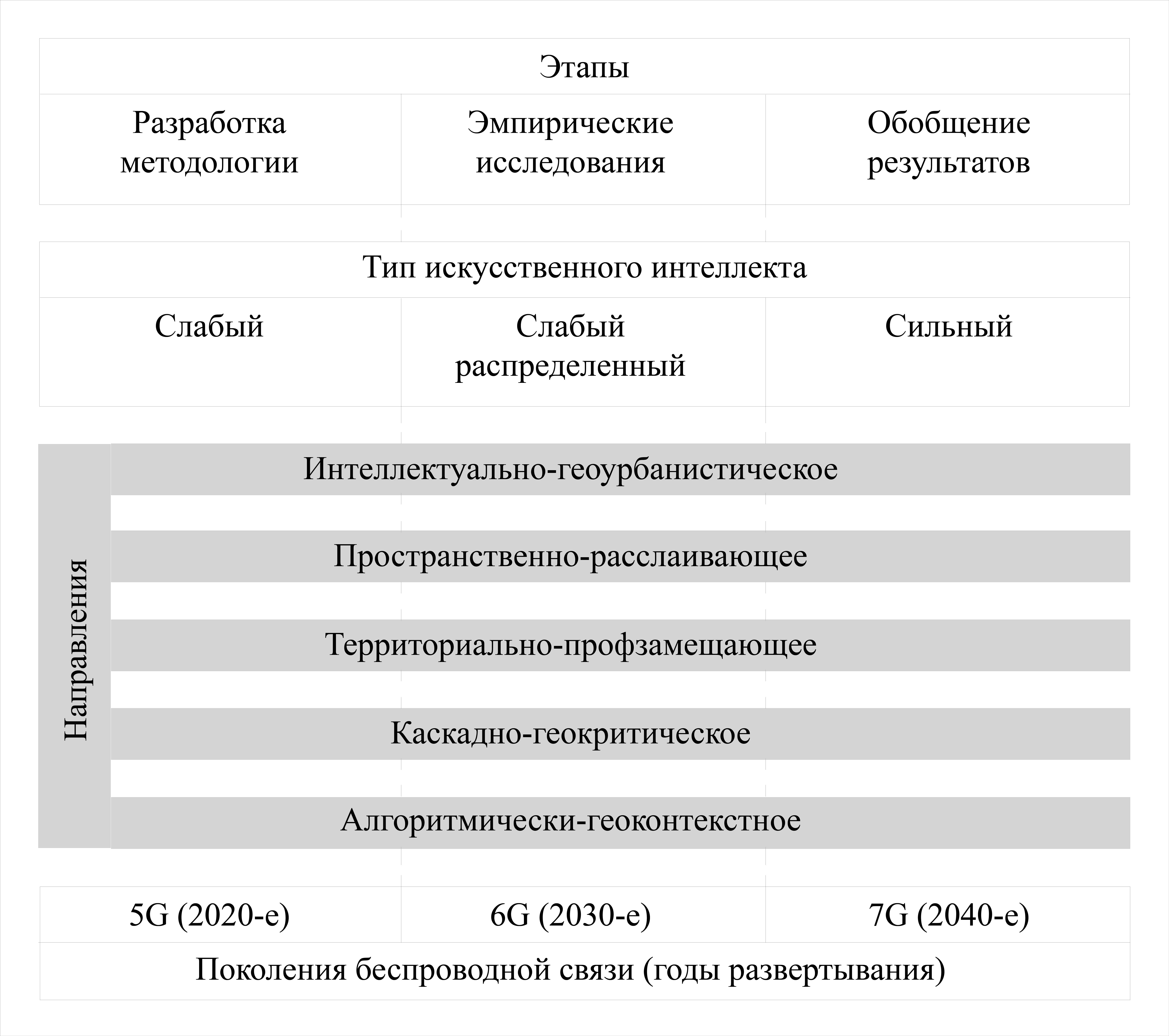 Каждое из пяти научных направлений может пройти три этапа: разработка методологии будущих исследований социально-географических последствий развертывания РИИ; проведение эмпирических исследований на основе предложенной методологии и данных о негативном воздействии РИИ на социум; обобщение результатов второго этапа для корректировки методологии и выявления новых проблем. Необходимо учитывать взаимообусловленность перехода от слабого к сильному ИИ, с одной стороны, и развертывания пятого и последующих поколений беспроводной связи – с другой [Lu, Zheng 2020; Vaigandla 2021], что позволит сопоставить эти процессы на оси времени и определить примерные сроки выполнения задач каждого этапа (рис. 1). Привязка к десятилетиям не исключает, например, разработки новой методологии и обобщения первых результатов в 2030-е гг., а лишь указывает на преобладание того или иного направления исследований. Кроме того, изучение слабого и сильного ИИ также может проходить в три этапа, но в рамках других (не рассмотренных в данном случае) направлений. Тогда, к примеру, в следующем десятилетии эмпирические исследования последствий развертывания РИИ можно проводить параллельно с разработкой методологии изучения последствий внедрения сильного ИИ.