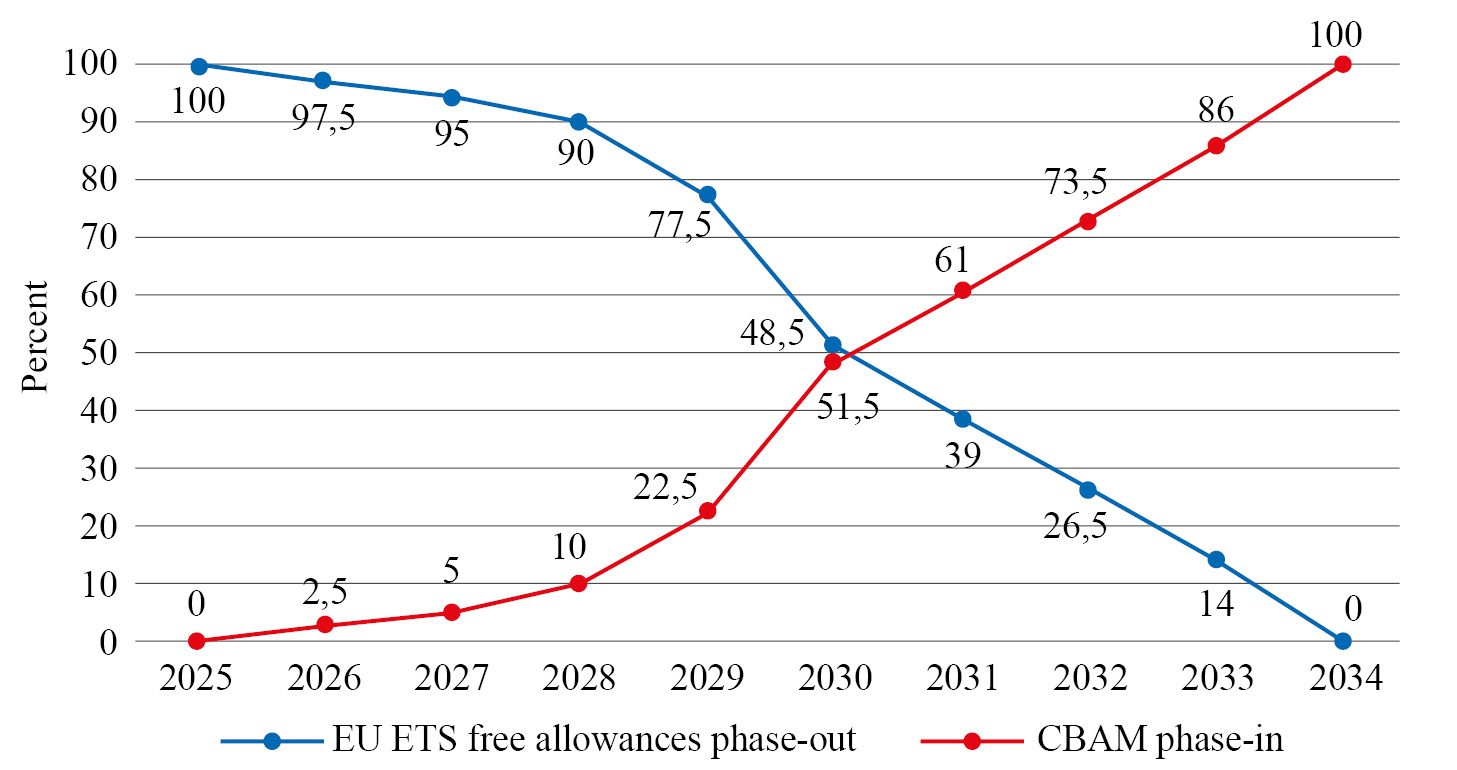 2. Figure 1. Schedule for the withdrawal of free EUAs from the EU ETS and the introduction of taxation on imported products in the CBAM in the volume of EU industrial emissions in 2026–2034, %