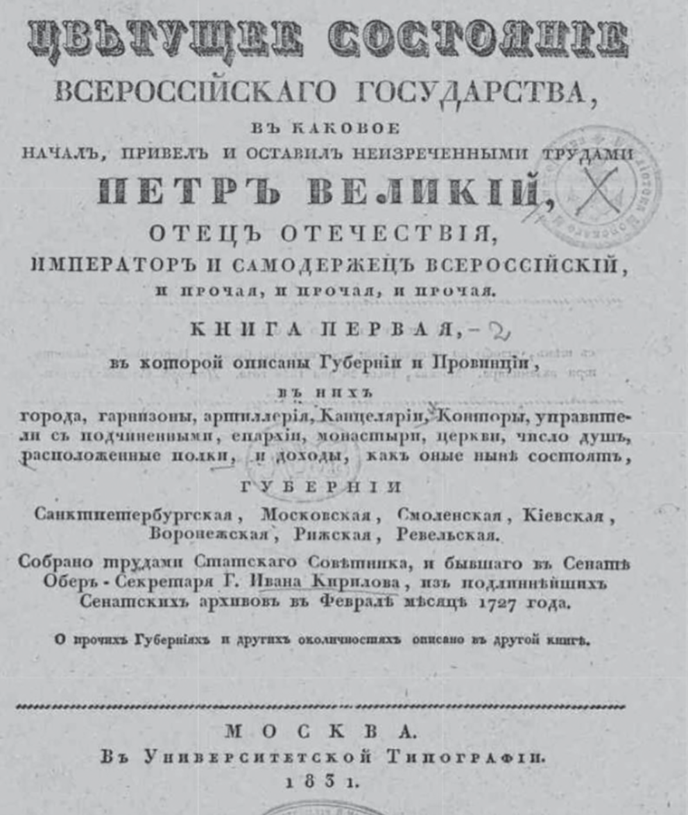 - Кирилов И.К. Цветущее состояние всероссийского государства, в каковое начал, привёл и оставил неизреченными трудами Пётр Великий, отец отечествия, император и самодержец всероссийский. М., 1831.