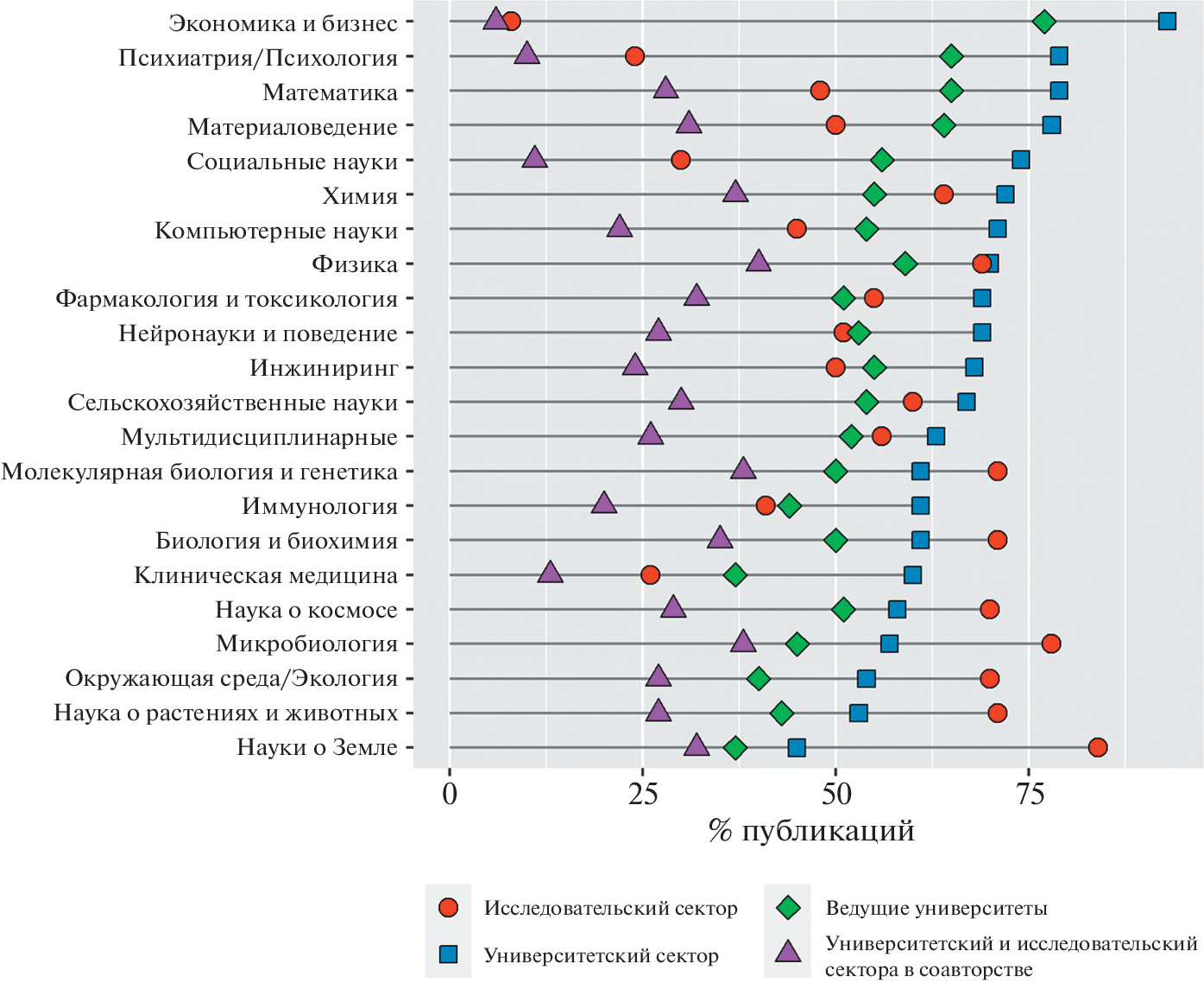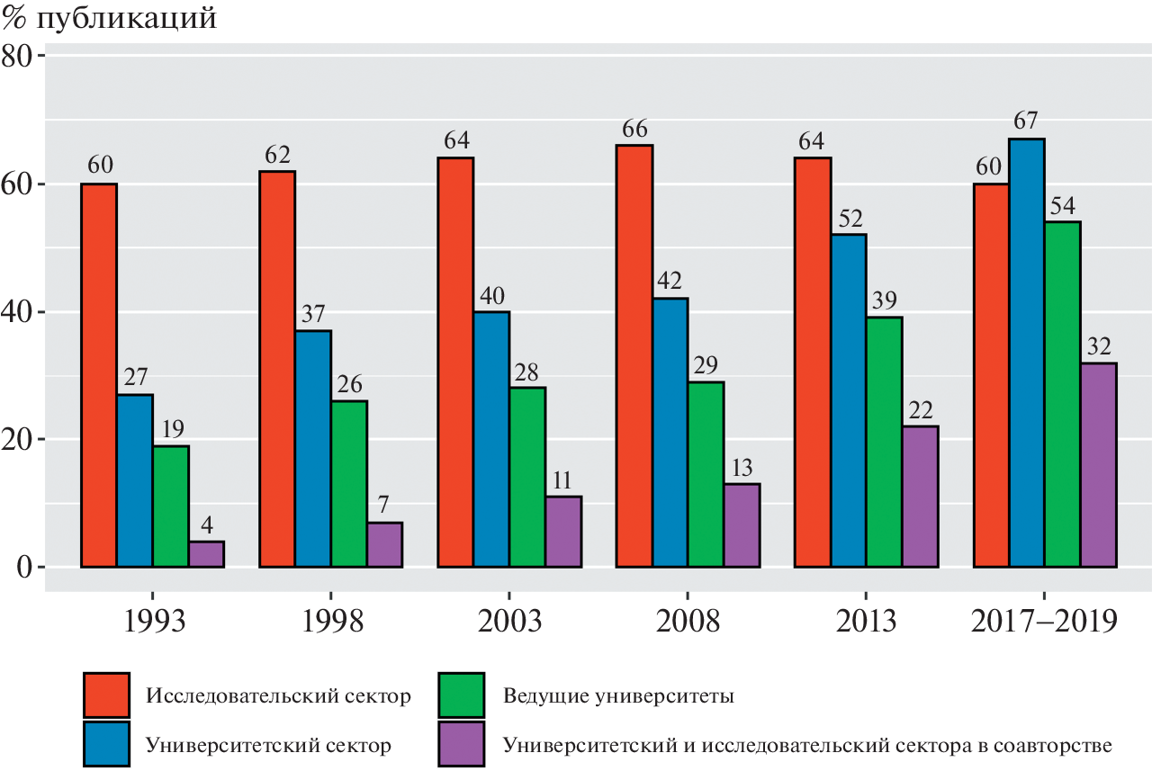 Modern Russia inherited the Soviet scientific system, in which the university sector was rather weakly involved in research activities. However, by now the situation has changed significantly. The Russian government has actively stimulated the development of science in universities. It is shown in this article that the contribution of the university sector to the production of scientific knowledge has grown significantly and is already comparable with the contribution of the research sector in a number of indicators. The results of scientific research in both sectors—university and research—are published in journals of a comparable level, and the levels of citation of these publications are also comparable. Note that in economics, psychology and psychiatry, and social sciences, the university sector dominates. In addition, researchers from universities are more involved in international scientific collaboration. However, the sector itself is heterogeneous. Its main scientific achievements are related to the results obtained in leading research universities.