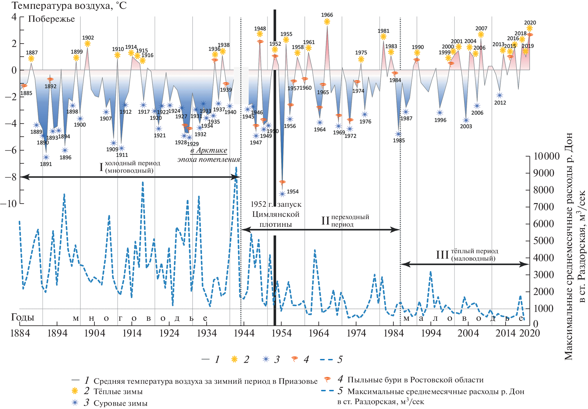 В последние 15 лет на юге европейской части России, в том числе в Приазовье, наблюдается период маловодья, связанный с уменьшением речного стока. Это приводит к негативным последствиям, которые сказываются на населении региона, сельском хозяйстве, судоходстве, трансформациях экосистем Азовского моря. В статье проводится ретроспективный анализ характера изменения климата и обводнённости территории на протяжении позднего плейстоцена и голоцена, основанный как на результатах палеогеографических исследований, так и на архивных и исторических данных. Показано, что изменение параметров среды, в том числе количества осадков, от которых зависит полноводность р. Дон, циклично. В настоящее время наблюдается цикл, ассоциированный со значительным уменьшением суммы годовых осадков и повышением среднегодовых температур.