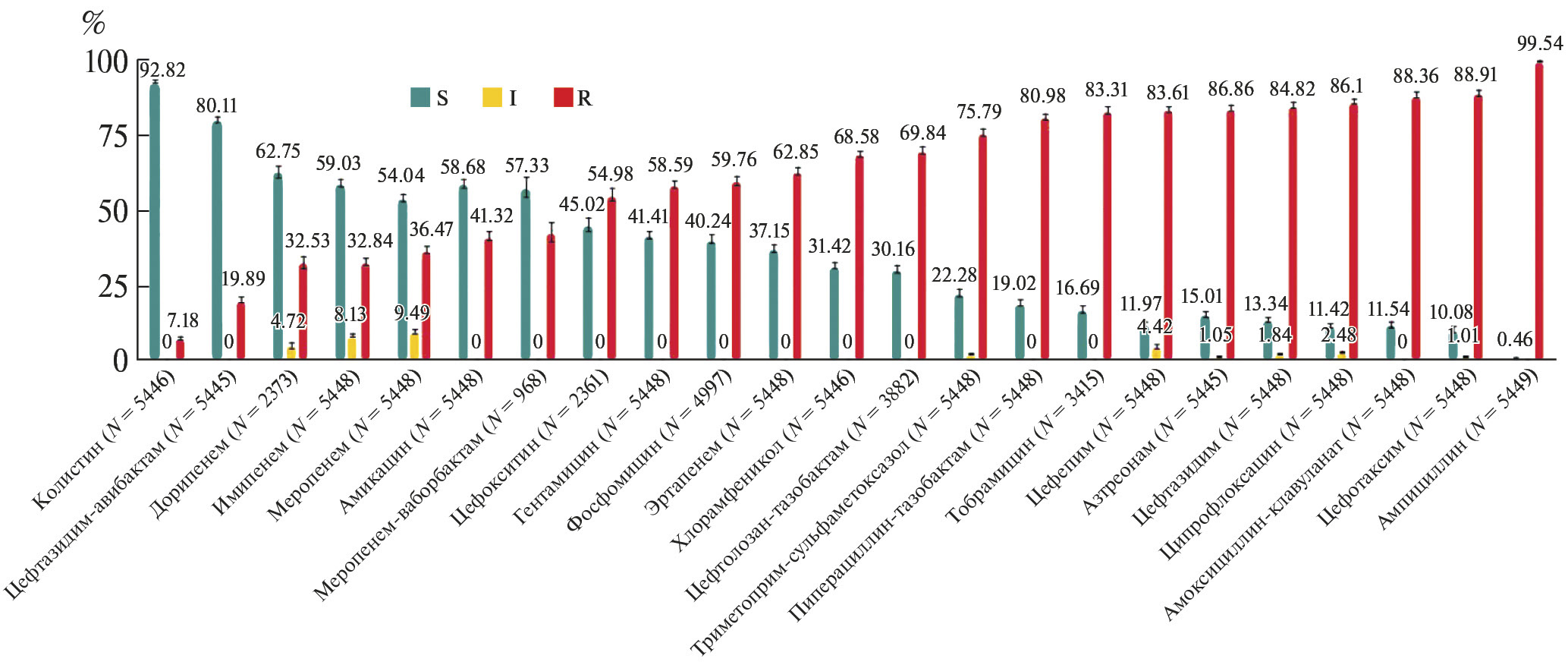 Условные обозначения: S – чувствительные изоляты, I – чувствительные при увеличенной экспозиции препарата, R – резистентные