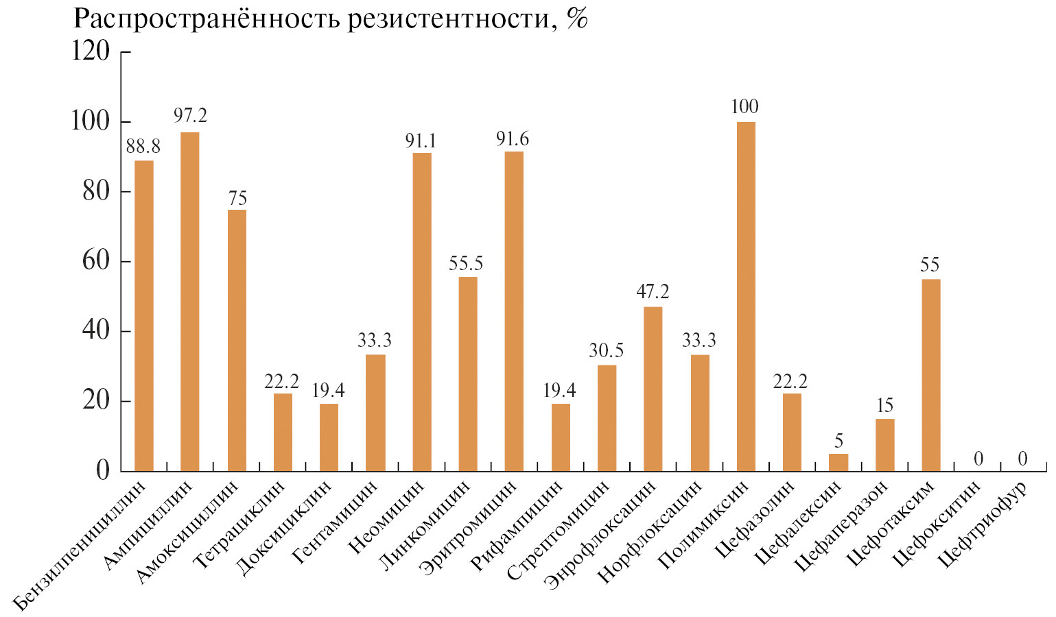Рис. 1. Фенотипическая резистентность бактерий, вызывающих мастит коров