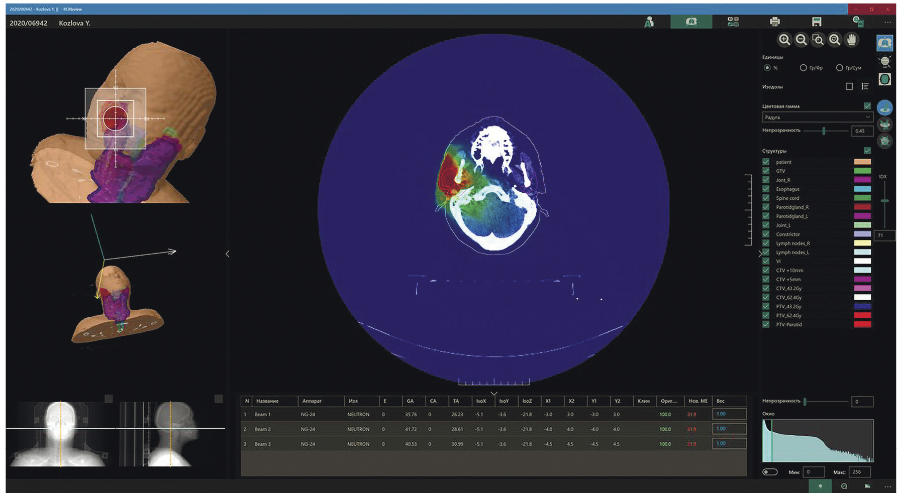 Система планирования нейтронной терапии (собственная разработка в рамках комплекса КНТ) позволяет эффективно рассчитывать дозные поля2, изодозные кривые распределения и целевые показатели гистограммы “доза–объём” на эквивалентной модели пациента, получаемой путём анализа топометрической информации в стандартизованном формате DICOM. В рамках системы планирования осуществляется преобразование чисел Хаунсфилда исходного КТ-изображения пациента в плотности согласно функционалу, описанному в [18], и материальному составу вокселей (элементов объёмного изображения) на базе преобразования [19]. Затем на основании интерактивного (управляемого медицинским физиком) выбора полей облучения и ограничений методом Монте- Карло рассчитываются специфичное для КНТ распределение дозного поля в пациенте и ожидаемое число мониторных единиц. В основе расчёта лежит фазовое пространство, оценённое путём независимого подробного моделирования непосредственно на нижнем срезе окна коллиматора для каждой из предлагаемых вставок. Нормирование на мониторные единицы осуществляется по прямым измерениям в трёхкоординатной системе перемещения внутри водного фантома, проводимым на стадии ввода комплекса в эксплуатацию в реальных физических условиях облучения. Система планирования позволяет задать константную величину относительной биологической эффективности излучения, а также рассчитать биологически взвешенную дозу как результат сочетанного действия компонентов протонного излучения (преимущественно протоны широкого спектра энергий, альфа-частицы, ядра углерода, азота и кислорода). Компоненты биологического модуля системы планирования были независимо апробированы в модельных экспериментах и продемонстрировали быстродействие [20]. На рисунке 2 представлен скриншот системы планирования пациента при лечении опухоли правой слюнной железы.