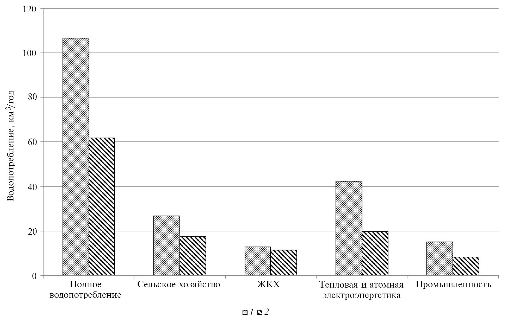 Рис. 1. Планируемое в “Водной стратегии Российской Федерации на период до 2020 г.” (1) и фактическое (2) водопотребление на 2020 г.