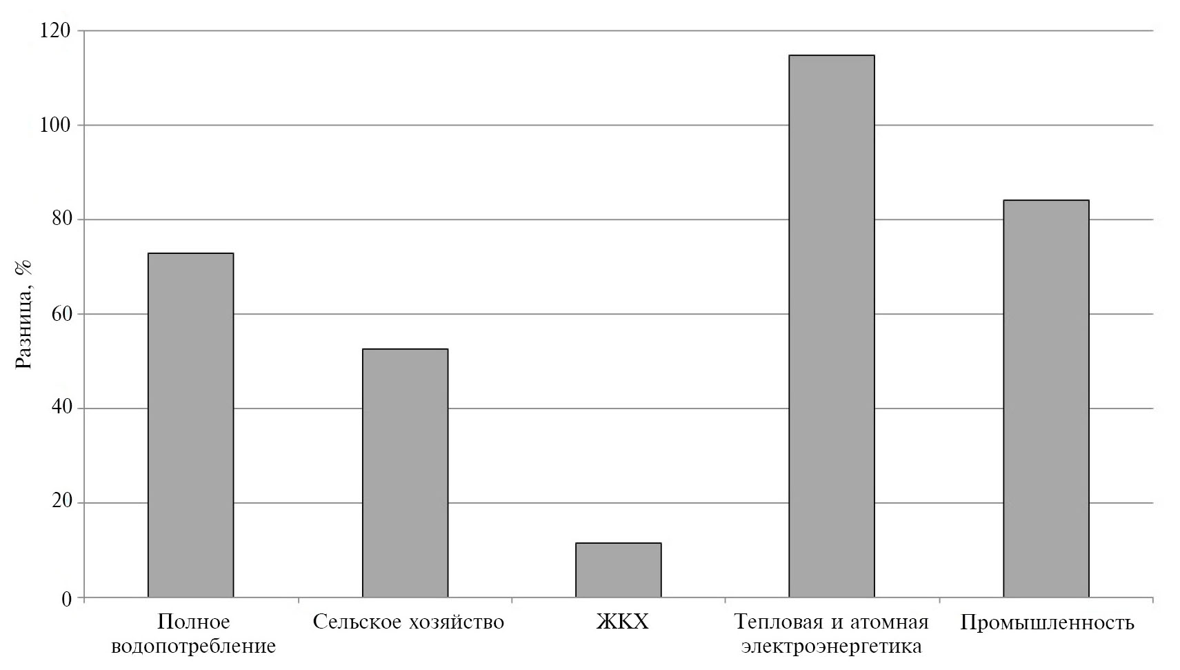 По ряду показателей фактическое водопотребление оказалось значительно ниже прогнозируемого. Наибольшие различия – в полном водопотреблении в промышленности (в 3.6 раза в США, в 2.4 раза в мире) и в суммарном полном водопотреблении (более чем в 2 раза в США, в 1.5 раза в мире). Безвозвратный расход заметнее всего отличается в коммунальном хозяйстве (ниже предсказанного в 2.7 раза) и промышленности США (в 1.7 раза), а в мире – в сельском хозяйстве и суммарно (в 1.4 раза). По другим статьям водопотребления прогнозируемые величины довольно близки к фактическим, причём безвозвратный расход в промышленности в мире оказался даже выше ожидаемого.