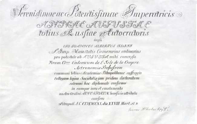 Рис. 4. Диплом Л. Делиля де ла Кройера от 28 марта 1740 г., подтверждающий его членство в Петербургской академии наук [16, л. 1]