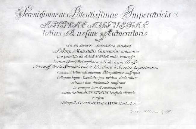 Рис. 5. Диплом Х.Ф. Гросса от 28 марта 1740 г., подтверждающий его членство в Петербургской академии наук [16, л. 2]