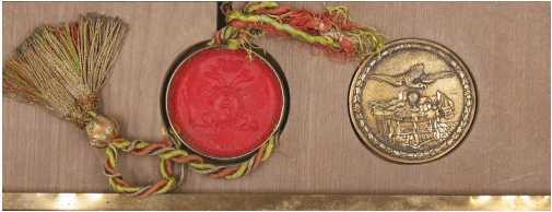 Рис. 7. Мастичная академическая печать в круглом серебряном позолоченном капселе на дипломе М.В. Ломоносова, фрагмент [23, л. 1]