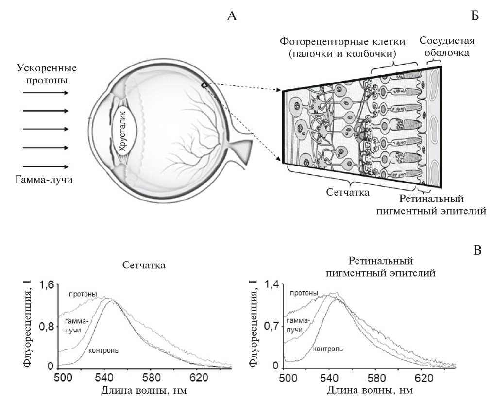Рис. 1. Схема глаза позвоночных. Облучение мыши ускоренными протонами или гамма-лучами в дозе 4 Гр. А – структуры глаза: зрачок, хрусталик, сетчатка и ретинальный пигментный эпителий; Б – сетчатка, фоторецепторные клетки (палочки и колбочки), ретинальный пигментный эпителий, сосудистая оболочка; В – спектры флуоресценции хлороформных экстрактов, полученных из сетчаток и ретинального пигментного эпителия глаз мышей, облучённых дозой 4 Гр. Длина волны возбуждения составляла 488 нм. Спектры флуоресценции нормализованы при длине волны 550 нм Источник: рисунок адаптирован из [2].