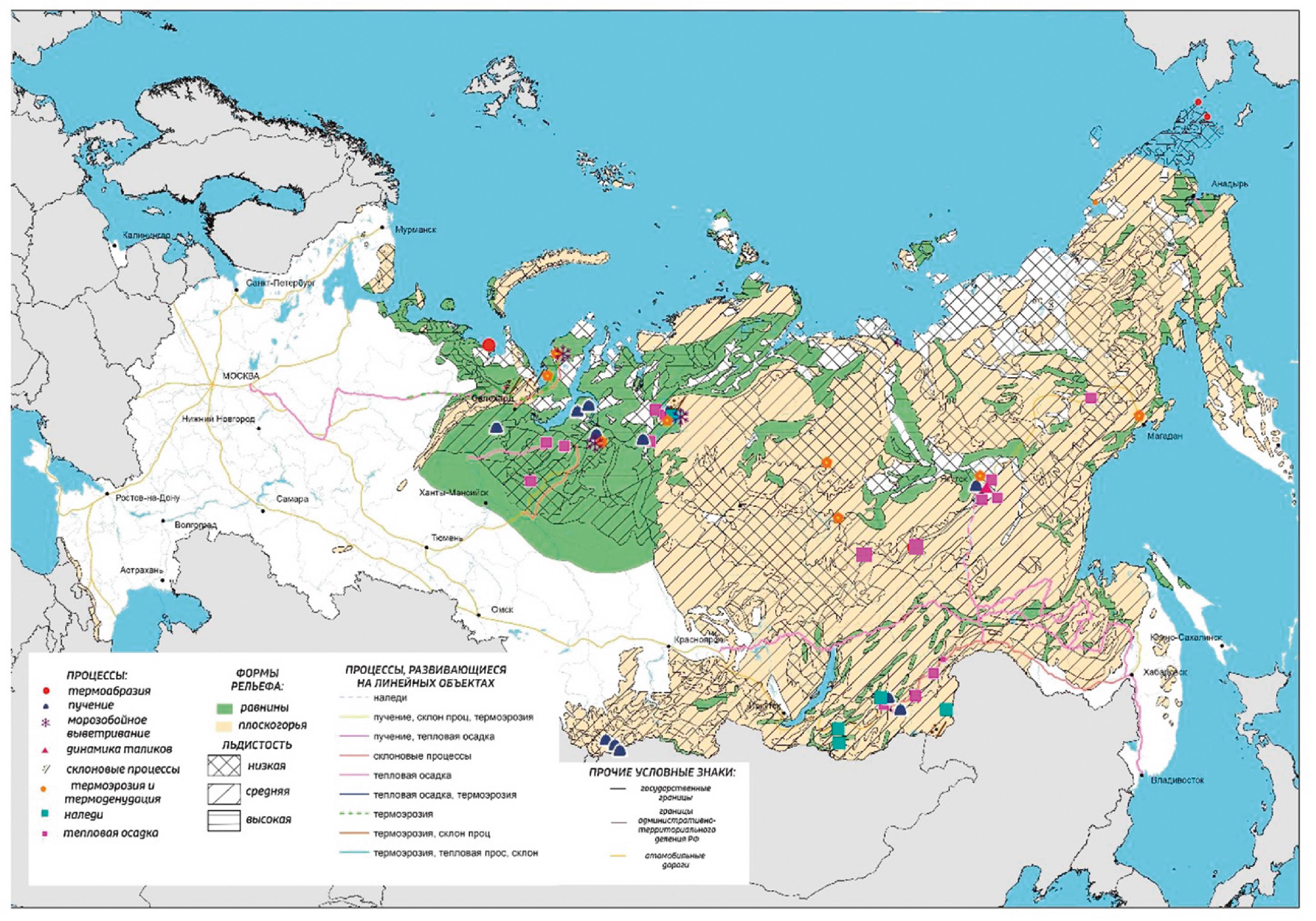 Характеризуя опасные процессы на территории России, около 70% площади которой занимает криолитозона, нельзя не остановиться на многочисленных геокриологических угрозах: оттаивание многолетнемёрзлых грунтов и вытаивание подземных льдов, тепловые просадки и осадки сооружений, морозобойное растрескивание и пучение грунтов, наледеобразование и формирование кратеров газовых выбросов. Здесь следует выделять последствия изменения свойств мёрзлых грунтов, прежде всего снижение их несущей способности, и активизацию собственно геокриологических процессов, которые и служат основным источником угроз для инфраструктуры страны [4]. Их активность зависит от интенсивности изменений различных характеристик климата, но ещё более сильное воздействие оказывает реакция мерзлоты на нарушение условий теплообмена, вызываемого сооружениями.