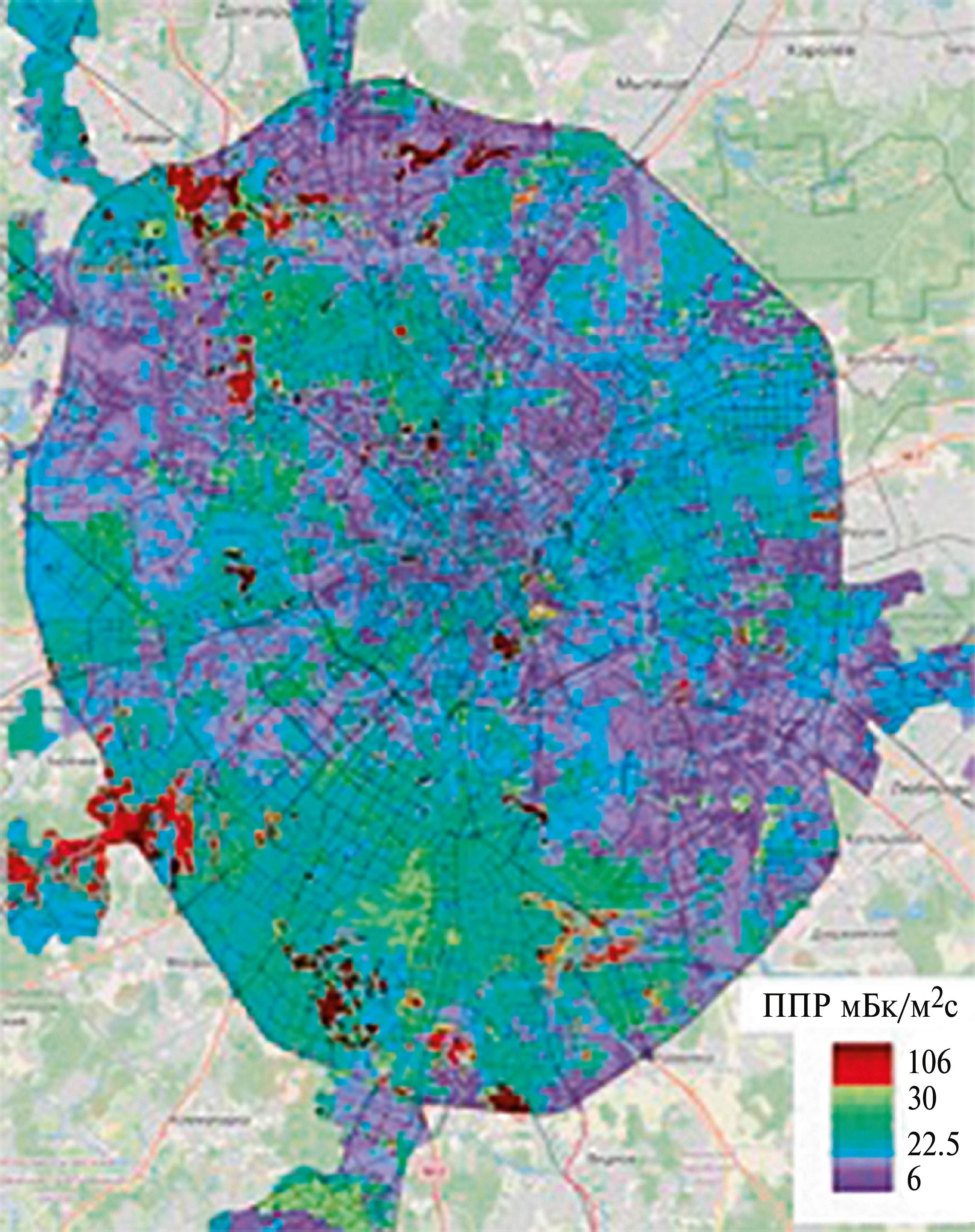 Рис. 9. Карта плотности потока радона на территории Москвы Источник: [12].