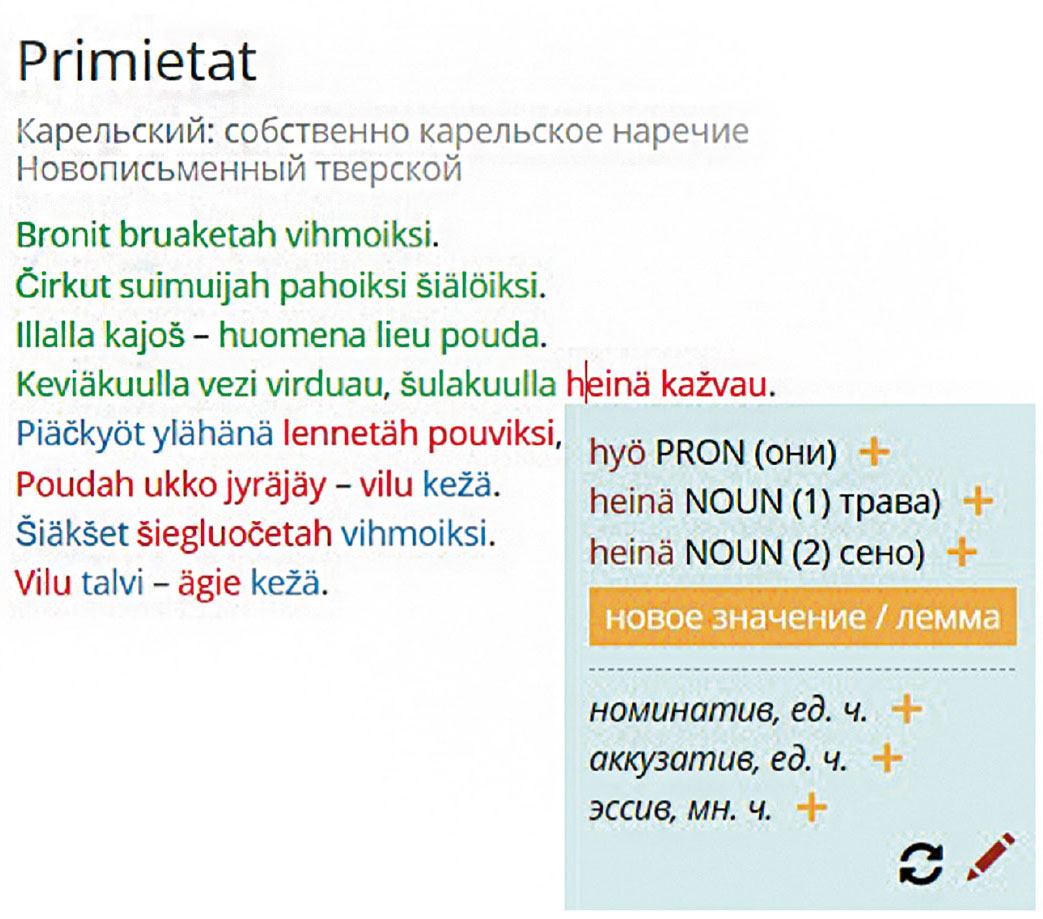 Все загружаемые тексты размечаются автоматически в среднем на 78% (табл. 2). Достигнуть такого показателя удалось за счёт внесения в словарь корпуса всех изданных ранее словарей нормированных вариантов карельского и вепсского языков с полными словоизменительными парадигмами. Редакторы проверяют автоматическую разметку, снимают омонимию, а также производят ручную разметку слов, не распознанных программой. Кликая на иконку “+”, можно выбирать верное значение и соответствующие грамматические признаки. Слово может остаться нераспознанным по двум причинам: в нём допущена орфографическая ошибка или оно отсутствует в словаре (рис. 5).