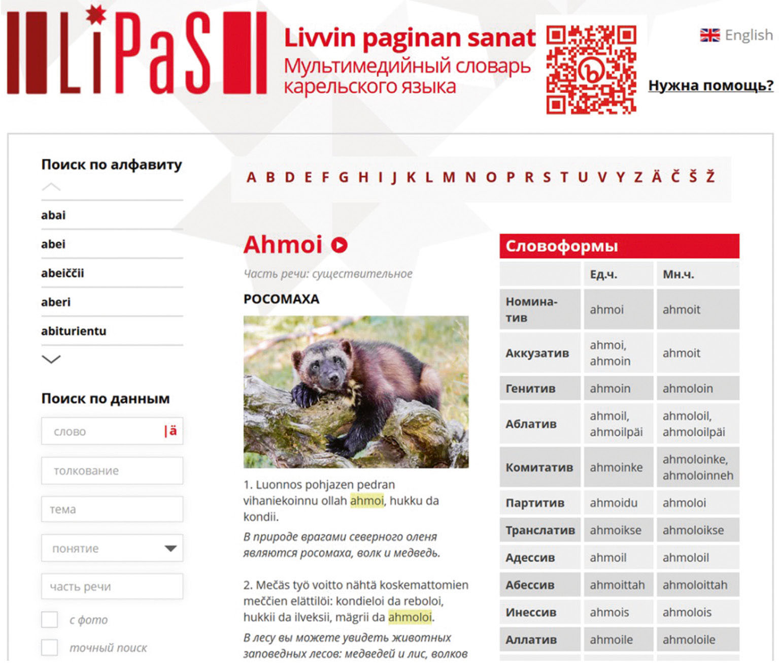 На основе данных корпуса разрабатываются приложения с интуитивно понятным интерфейсом для широкого круга пользователей, интересующихся прибалтийско-финскими языками Карелии, например, мультимедийный словарь карельского языка ливвиковского наречия LiPaS (от карел. “lipas” – сундучок, шкатулка) (рис. 10). Его целевая аудитория – школьники, студенты, слушатели курсов карельского языка и преподаватели. Словник формируется автоматически из текстов корпуса и постоянно пополняется по мере загрузки новых данных. Программа также предлагает иллюстративный материал (контекстные примеры) для каждого слова. Задача редактора – проверить правильность заполнения страницы словарной статьи, отобрать наиболее удачные примеры и снабдить их переводом на русский язык. Работа по наполнению мультимедийного словаря LiPaS и созданию новых словарей (для других нормированных вариантов) продолжается. Подобные приложения позволяют компенсировать ограниченность информации традиционных бумажных словарей, что особенно актуально при изучении языка.