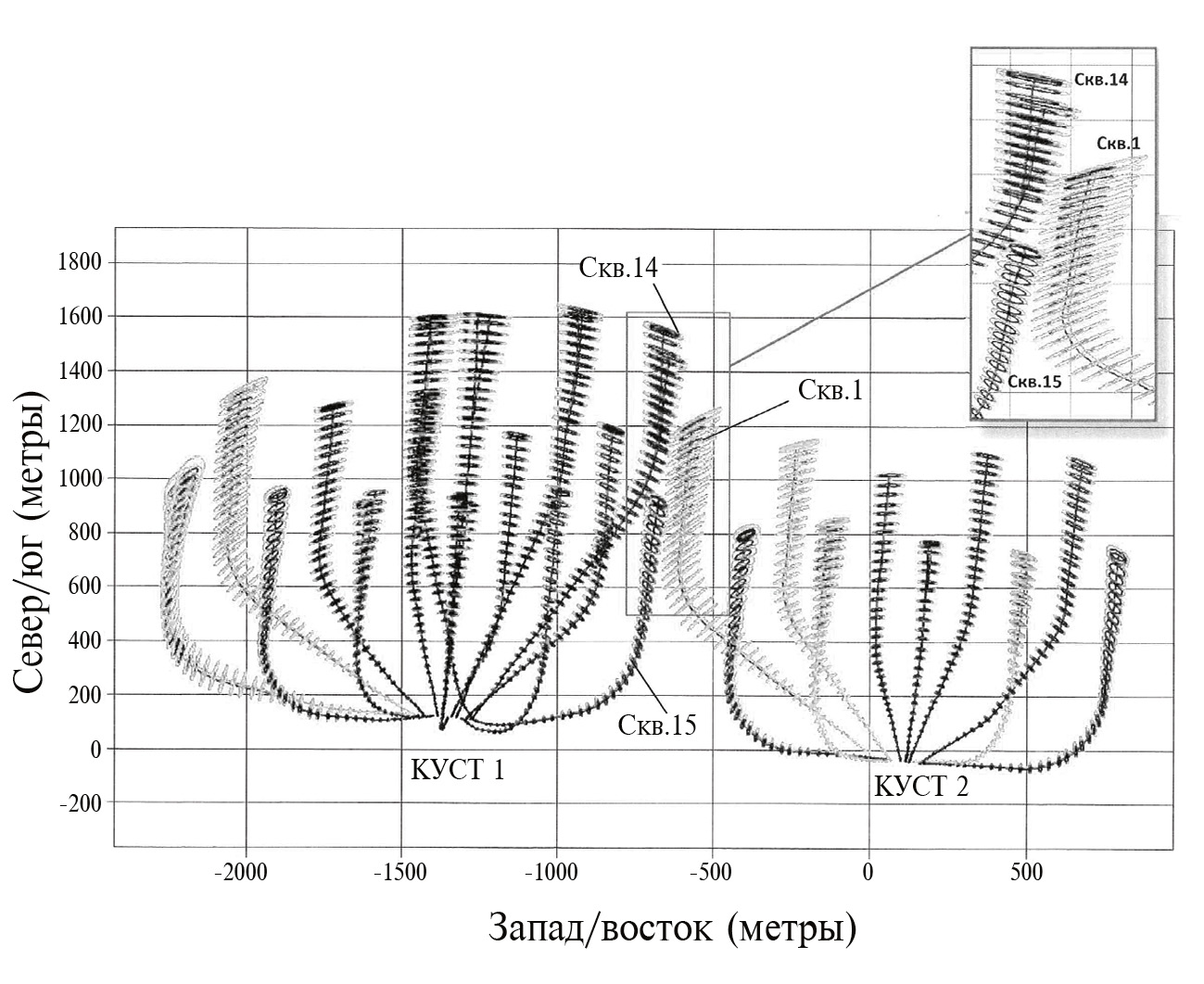 На рисунке 1 приведён реальный пример кустового бурения в условиях плотной сетки. Характерные расстояния между скважинами составляют несколько десятков метров, поэтому одна из основных особенностей их проводки кустами – необходимость соблюдения условий непересечения стволов скважин. Таким образом, технология ННБ неизбежно требует высокой точности позиционирования и навигации, которую не способны обеспечить традиционные гироскопические измерения. С этой целью буровая колонна оснащается специальной инклинометрической системой. Она включает в себя трёхосный акселерометр для контроля зенитного угла и трёхосный магнитометр для контроля азимута. Именно по этим двум углам и оцениваются текущие траекторные параметры скважины относительно их проектных значений.