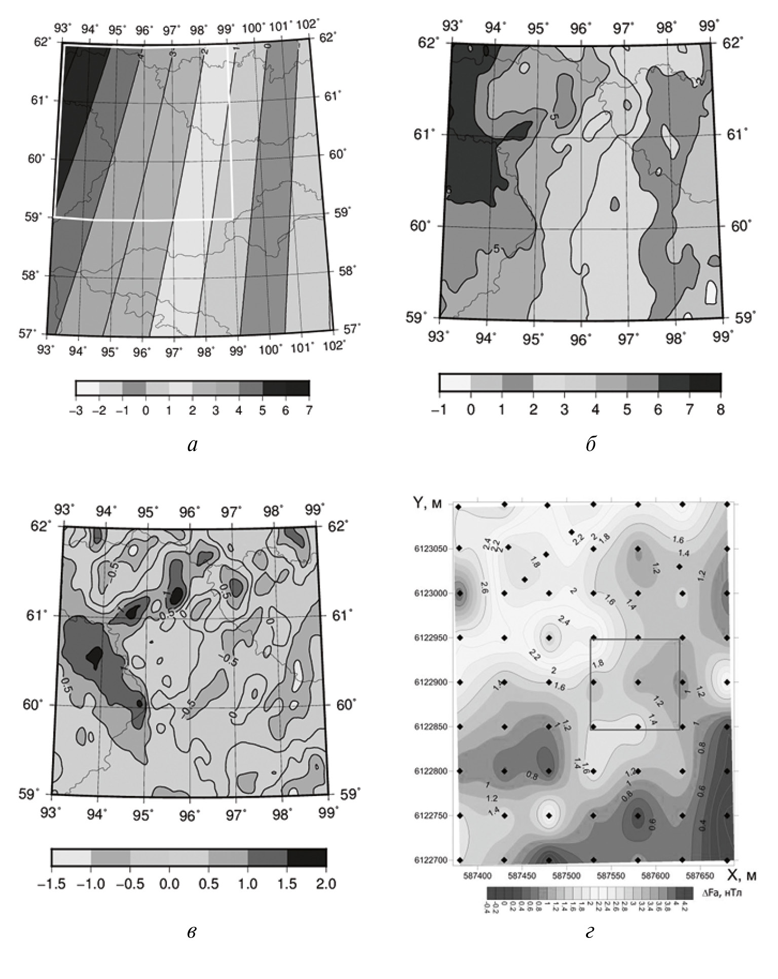 В первом приближении, чтобы определить генеральное направление на северный магнитный полюс и вычислить истинный азимут буровой колонны, используются модели главного магнитного поля Земли, слабо изменчивого во времени. Модель главного магнитного поля обеспечивает пространственное разрешение порядка 800 км. На рисунке 2а представлено распределение значений магнитного склонения на одном из месторождений. Видно, что на площадке 100×100 км значение склонения главного МПЗ является константой. Однако в действительности магнитное поле сильно изменчиво по пространству ввиду неоднородной намагниченности земной коры. Для оценки таких аномалий привлекаются модели литосферного магнитного поля, которые характеризуются пространственным разрешением порядка 10 км (рис. 2б). В совокупности с моделями главного поля они позволяют выявлять локализованные аномалии склонения магнитного поля, вызванные литосферными источниками, которые в приведённом примере могут достигать значений до 2о (рис. 2в). Неучёт таких аномалий недопустим, поскольку точность определения азимута буровой колонны при ННБ не должна превышать 1.5–2о. Для учёта локальных неоднородностей магнитного поля непосредственно в окрестности месторождения дополнительно проводится региональная магнитная съёмка для локализации соответствующих источников. Пространственное разрешение таких съёмок составляет 10−100 м (рис. 2г). Построение аналитических моделей для адекватного описания полного вектора магнитной индукции в любой заданной точке трёхмерной среды представляет собой отдельную наукоёмкую область исследований.