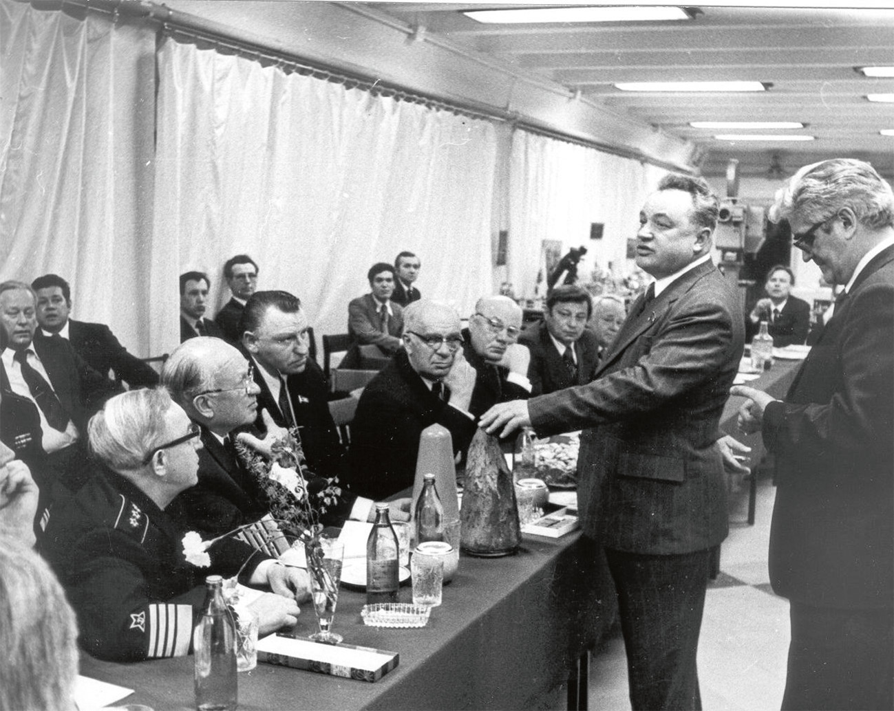 В.П. Макеев на выездном совещании в КБМ с участием Главнокомандующего ВМФ адмирала флота С.Г. Горшкова (первый слева) и Министра общего машиностроения СССР С.А. Афанасьева (третий слева) 1979 г.