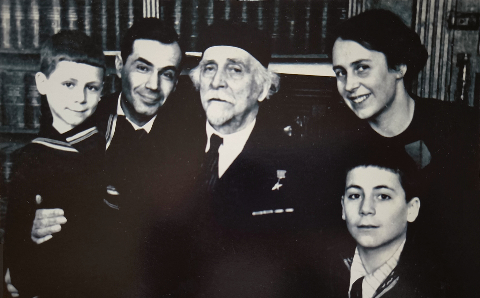 Николай Дмитриевич Зелинский (в центре) с дочерью Раисой Николаевной Зелинской-Платэ (справа), зятем Альфредом Феликсовичем Платэ (слева) и внуками Николаем (справа) и Феликсом (слева). 1946 г.
