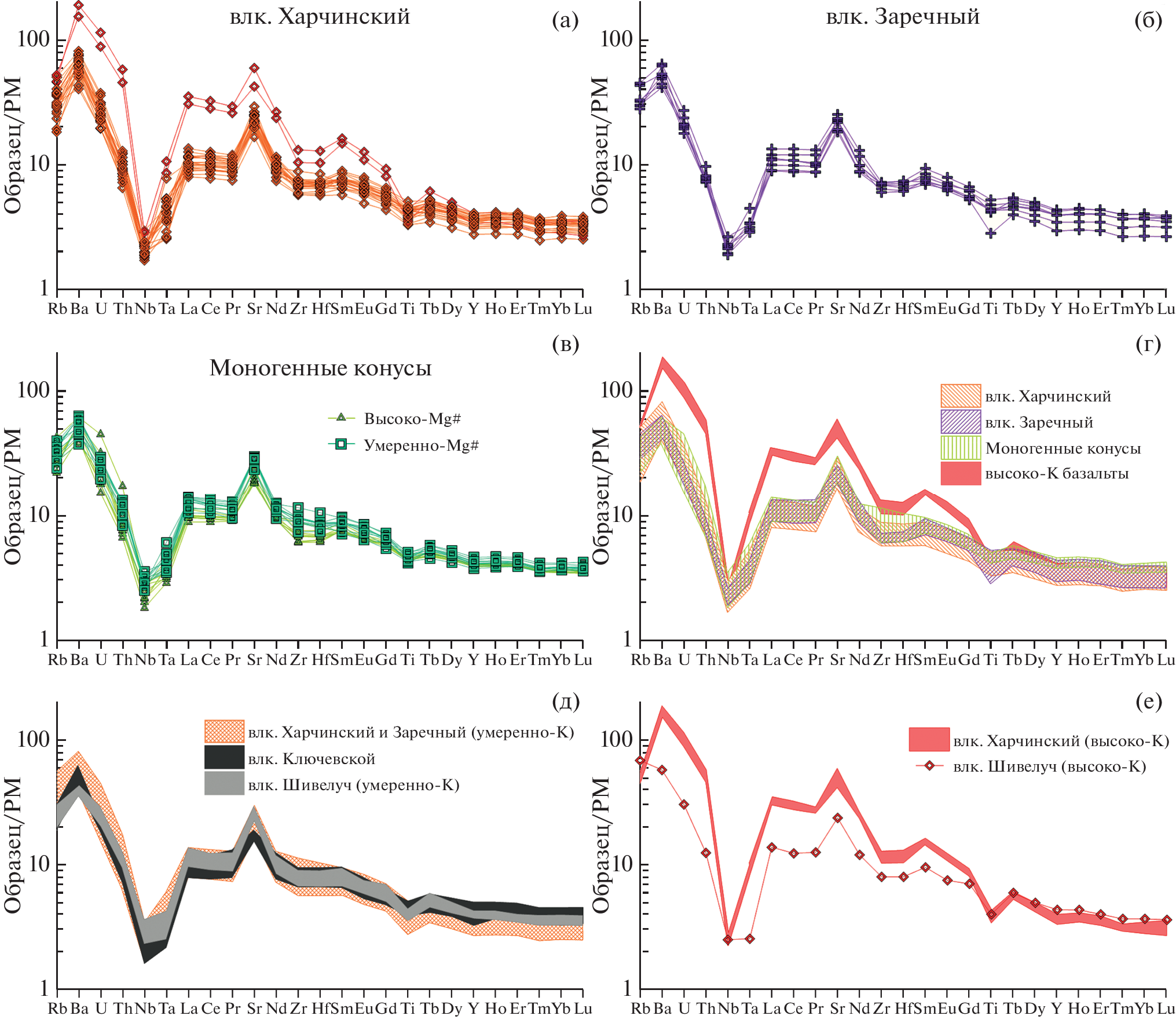 The Kharchinsky and Zarechny volcanoes and the Kharchinsky Lake zone of monogenetic cones are unique eruptive centers of magnesian lavas located above the northern margin of the Pacific Plate subducting beneath Kamchatka. This work presents new geochemical data on the composition of rocks (55 samples) and minerals (over 900 analyses of olivine, pyroxenes, amphibole, and plagioclase) of these centers analyzed by XRF and LA-ICP-MS (rocks) and electron microprobe (minerals). Most of the studied rocks are represented by magnesian (Mg# = 60–75 mol. %), medium-K basalts and basaltic andesites. Moderate-magnesian (Mg# = = 52–59 mol. %) basaltic andesites are present among the monogenic cones of the Kharchinsky Lake. The rare rock varieties include high-K basalts-basaltic andesites of dikes in the center of the Kharchinsky volcano and magnesian andesites (Mg# = 58–61 mol. %) of the extrusions of Zarechnу volcano. The distribution of trace element contents in these samples demonstrates the enrichment of large-ion lithophile elements, light REEs and depletion of high field strength elements and heavy REEs typical of arc rocks. High-K basalts and basaltic andesites show anomalous enrichment in Ba (>1000 ppm), Th (>3.8 ppm), U (>1.8 ppm), Sr (>800 ppm, Sr/Y > 50) and light REE (La > 20 ppm); their compositions are close to those of low-Si adakites. Basalts and basaltic andesites contain high-Mg olivine phenocrysts (up to Fo92.6) and clinopyroxene (Mg# up to 91 mol. %). The rocks show petrographic and geochemical signs of fractional crystallization along with the processes of mineral accumulation and magma mixing. Some of the olivine phenocrysts show high NiO contents (up to 5000 ppm) and elevated Fe/Mn ratio (up to 80), interpreted as evidence of participation of the pyroxenite source in the magma generation processes. The use of Ca/Fe and Ni/Mg ratios allowed us to distinguish the composition fields and evolution trends of olivines associated with different sources – peridotite and pyroxenite, formed by the reaction of mantle wedge peridotites and high-Si melts of the subducted oceanic crust. The new data are consistent with other evidence of melting of the subducted Pacific plate edge beneath the northern part of the Central Kamchatka depression at the Kurile-Kamchatka and Aleutian subduction zone junction and testify to significant heterogeneity of the mantle in this area.