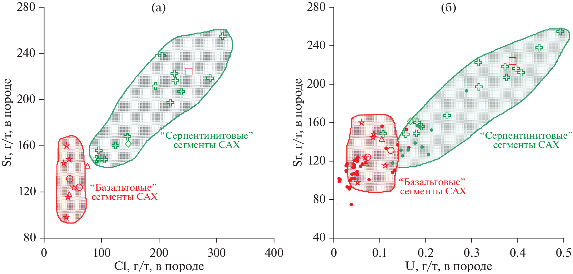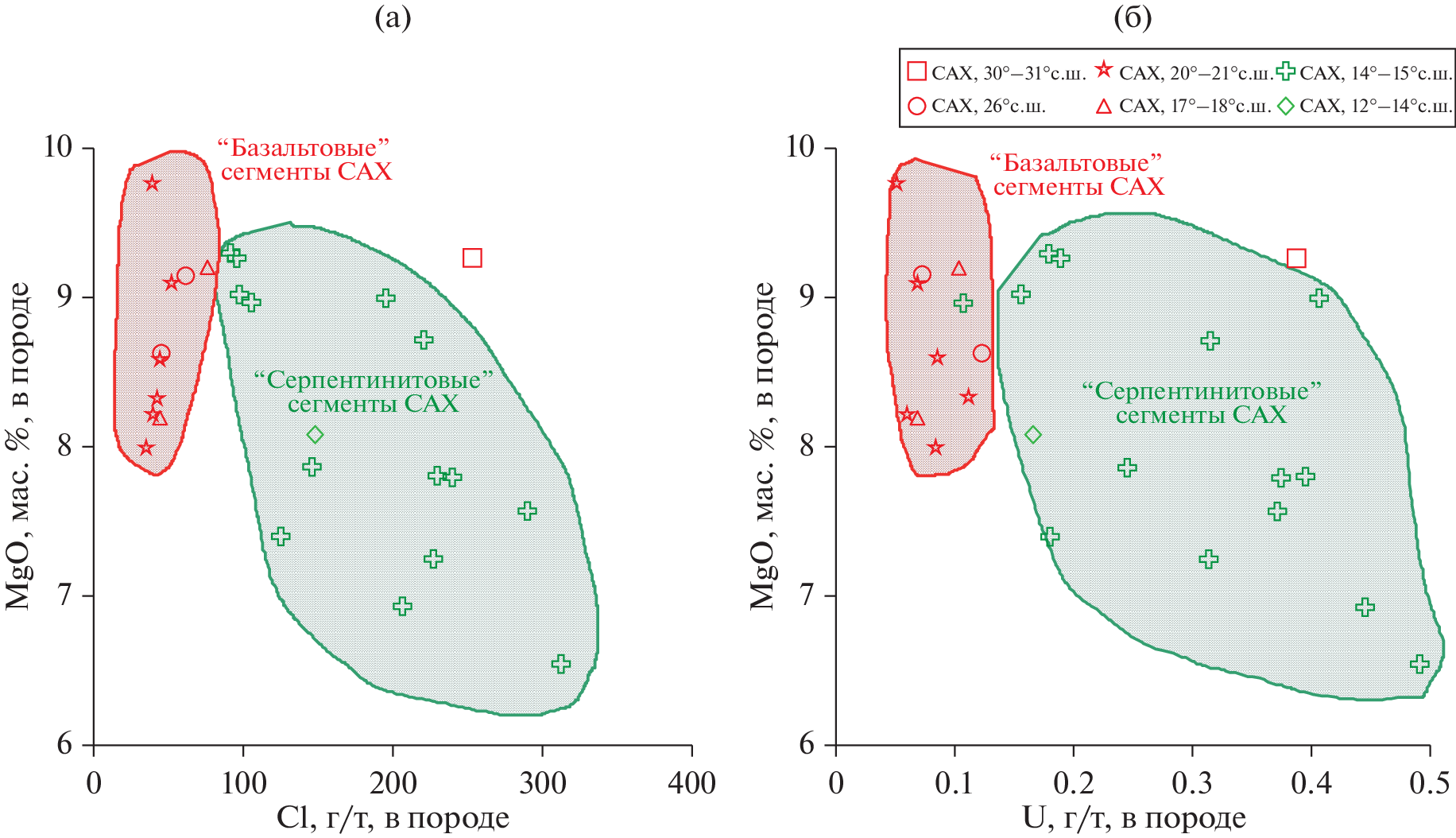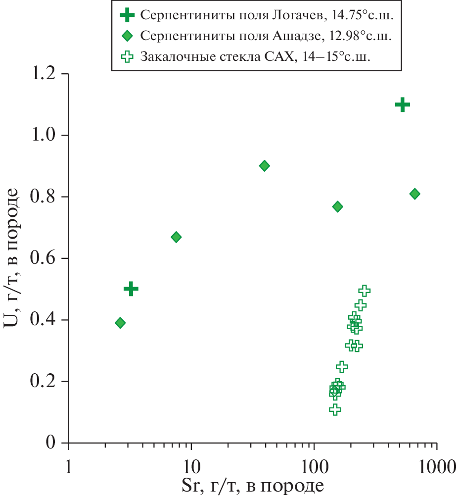 The geochemical peculiarities of sample collection of MORB chilled glasses obtained in six areas of the axial zone of the Mid-Atlantic Ridge (MAR), 12°–31° N have been studied. The results of this study provided information on the composition of the parent melts for these glasses and made it possible to assess probable geochemical effects reflecting the interaction of magmatic melts with hydrothermal systems of the MAR axial zone or with altered oceanic crust (AOC). It is shown that basalts of the E-MORB family which includes most of samples are localized mainly in the “cold” segments of the MAR in the crustal section of which serpentinites predominate. On the other hand, samples with depleted signature (N-MORB) belong to segments of the MAR in which serpentinite outcrops are either absent or play a subordinate role. The E-MORB chilled glasses from “cold” segments of the MAR show signs of contamination of basaltic melts with components borrowed either from the host serpentinites or from aqueous-saline fluids circulating in hydrothermal systems located in serpentinites (“serpentinite hosted”). Judging by the data obtained on the nature of variations in the content of Cl, U, and Sr in the studied chilled glasses belonging to the N-MORB family, there are no signs of intracrustal contamination. It is assumed that relics of the ancient continental lithosphere preserved under axial zone of the MAR and involved in the process of partial melting of the shallow mantle took part in the formation of E-MORB parental melts in some segments of the MAR.