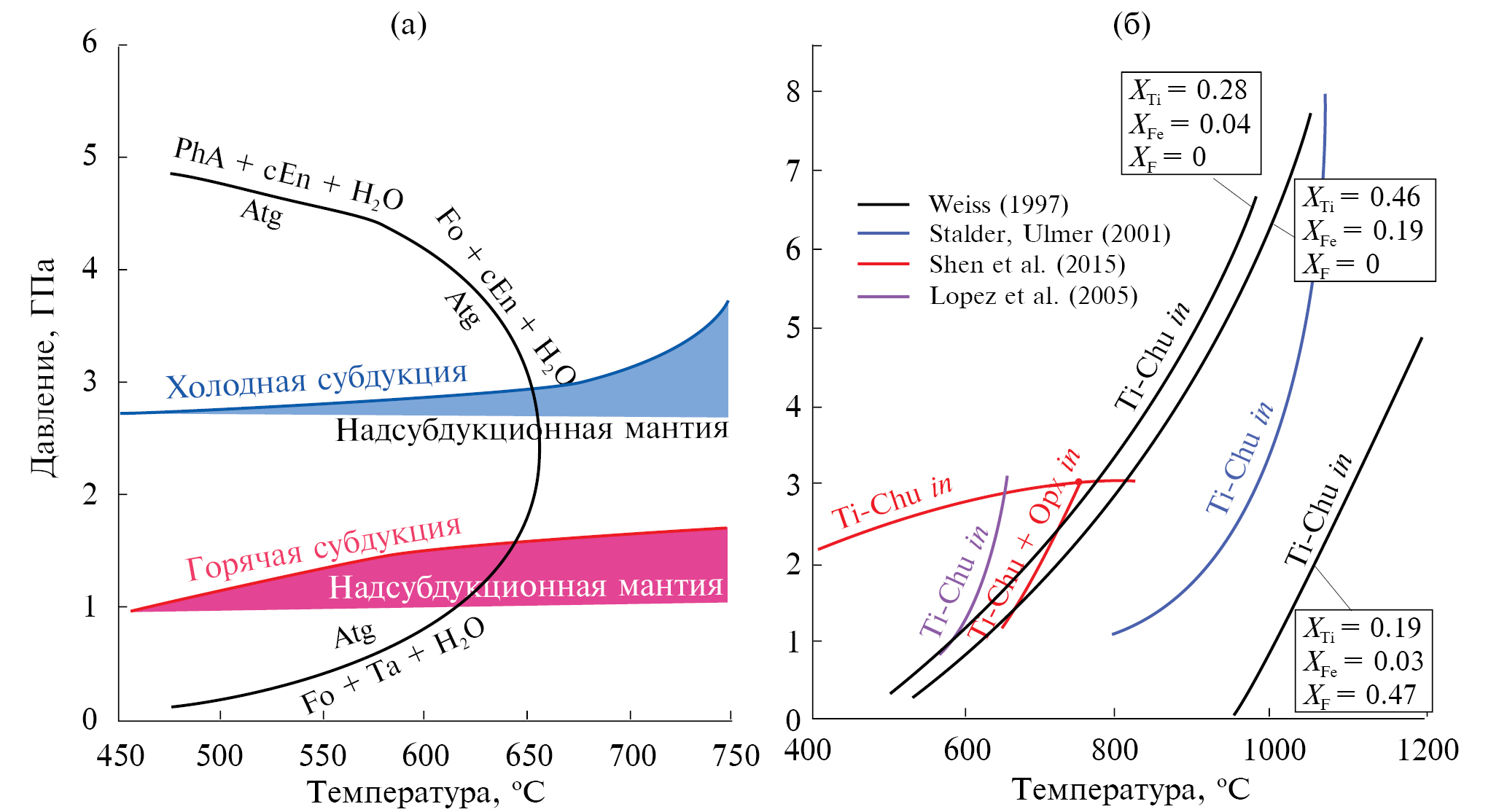 Красная и синяя сплошные линии – геотермы поверхности слэбов в горячей и холодной зонах субдукции соответственно (Syracuse et al., 2010). Красное и синее поля – Р-Т условия в мантии над слэбами в горячей и холодной зонах субдукции соответственно. (б) Линии стабильности Ti-клиногумита. Черные линии – реакция Ti-Chu = Ol + Ilm + H₂O по экспериментам с разными составами Ti-клиногумита (Weiss, 1997; Ulmer, Trommsdorff, 1999). XFe = Fe/(Fe + Mg), XTi = 2Ti/(2Ti + OH), XF = F/(F + OH). Синяя линия – эксперименты с валовым составом антигорита, Mg₃Si₂O₅(OH) с добавками FeO, Al₂O₃, F, TiO₂ (Stalder, Ulmer, 2001). Красные линии – эксперименты с антигоритом с добавками Ti-Chn, Ti-Chu, Ol, Brс (Shen et al., 2015); выше по давлению на смену Ti-Chu приходит Ti-Chn. Фиолетовая линия – реакция Ti-Chu = Ol + Ilm + H₂O на основе природных данных (Lopez Sanchez-Vizcaino et al., 2005). Ti-Chu in – граница Р-Т стабильности Ti-Chu в данной реакции.