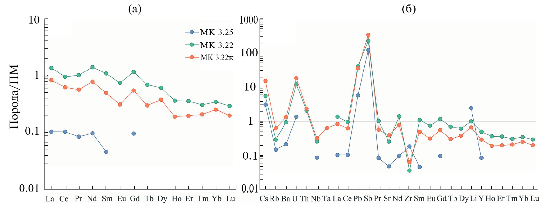 Оливин образует реликтовые зерна в матриксе породы и находится во включениях в ортопироксене в двух образцах метагарцбургитов (MK 3.23 и MK 3.25). Оливины в обоих образцах имеют составы, отличающиеся на сотую долю по магнезиальности (табл. 2, рис. 7). Зональность в пределах отдельных зерен не выявлена. Включения оливина в ортопироксене в каждой из пород, как правило, попадают в диапазоны составов оливинов матрикса. При этом все оливины заметно отличаются от оливинов из мантийных перидотитов и базальтов СОХ (MORB) повышенным содержанием никеля, частично попадая в большое поле оливинов из океанических островов, OIB (рис. 7а). Повышенное содержание никеля характерно для метаморфогенных оливинов из высокобарных комплексов (Endo et al., 2015).