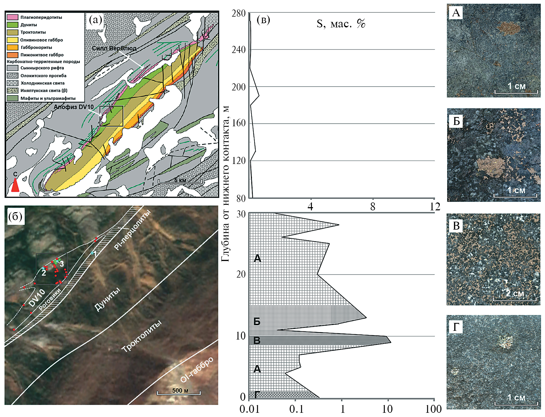 Рис. 1. Особенности геологического положения и сульфидной минерализации апофиза DV10 (Пшеницын и др., 2020). (а) Строение Йоко-Довыренского массива и участок опробования DV10; (б) точки опробования апофиза DV10; (в) cодержание серы и схематичное представление четырех типов сульфидной минерализации (A, Б, В, Г) в породах раздува апофиза DV10 (показаны с разрывом в интервале 30–80 м от нижнего контакта, причем для нижних 30 м использован логарифмический масштаб): А – крупные глобулы в оливиновых габброноритах из базальных горизонтов, Б – габбронориты с глобулярно-сидеронитовой вкрапленностью, В – сидеронитовые руды, Г – глобулы из закалочных пикродолеритов из нижнего контакта.