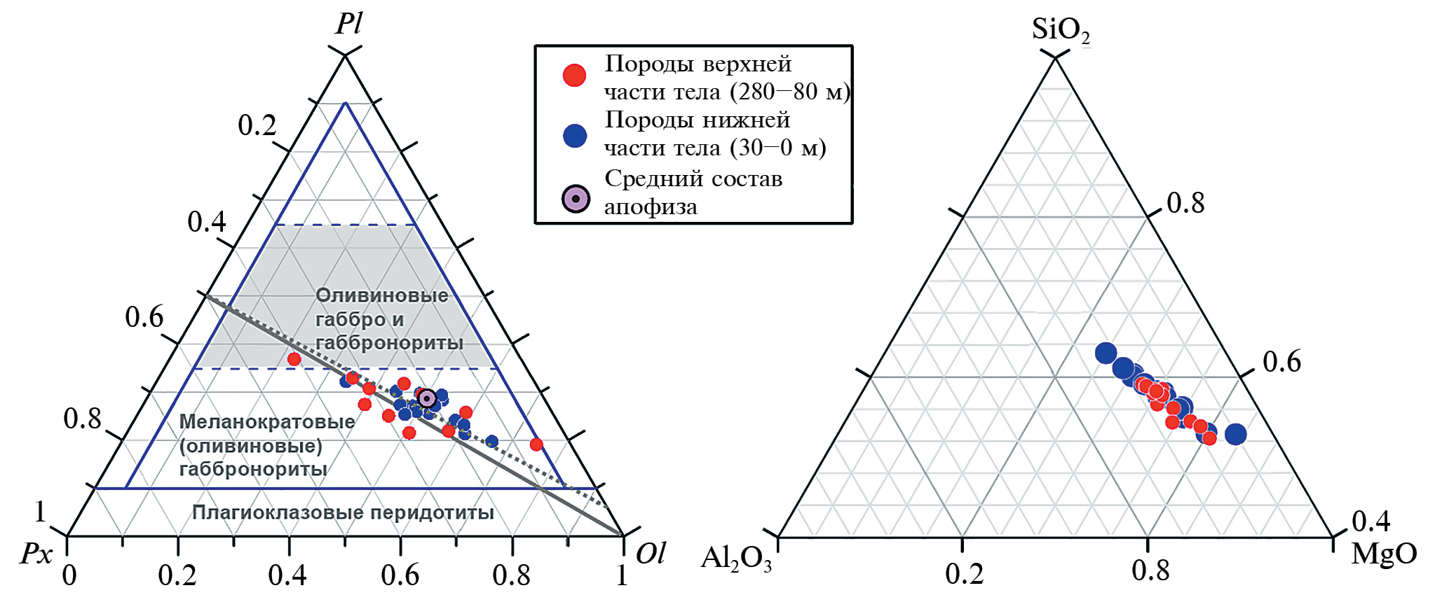 Три этих наиболее магнезиальных образца представляют разрез апофиза выше рудоносного горизонта. Это позволяет предполагать, что основная часть этого тела несет признаки локальной неоднородности, присутствия протокумулатов более высокой магнезиальности по сравнению с большинством слагающих пород. С учетом малого количества подобных образцов это незначительно сказывается на оценке среднего состава апофиза и положении этой фигуративной точки на диаграмме FeO–MgO, т. е. внутри фазового треугольника Ol–Pl–расплав.