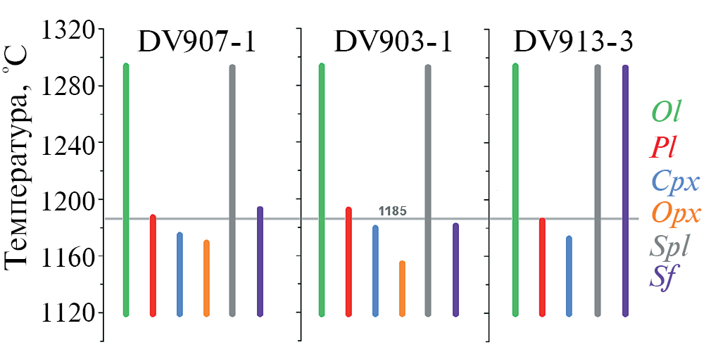 Результаты геохимической термометрии модельных траекторий кристаллизации демонстрируют схождение линий эволюции состава расплавов в компактный диапазон при температуре около 1185°C. Оценка среднего состава магматического расплава при этой температуре отвечает умеренно магнезиальному андезибазальту (53.6 мас. % SiO₂, 7.4 мас. % MgO) и богатой оливином суспензии, содержащей 52.1 мас. % кумулусного оливина (Fo83.6), 2.3 мас. % плагиоклаза (An79.7), 0.24 мас. % клинопироксена (Mg# 88.8), 1 мас. % алюмохромита (Cr# 0.62). Растворимость сульфидной серы при этих параметрах (SCSS) составляла 0.083 мас. %, такая магма была насыщена сульфидной серой.