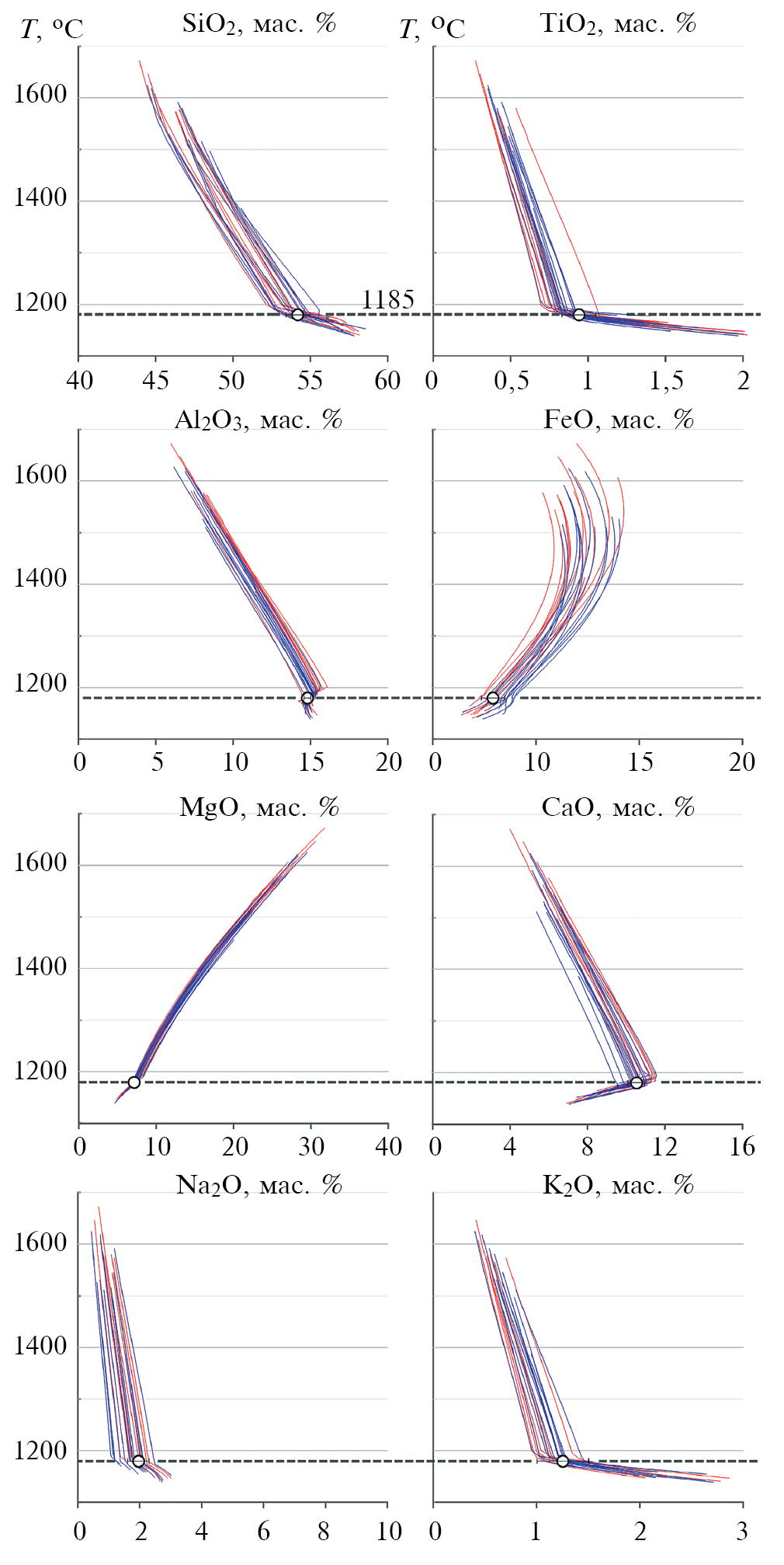Рис. 4. Линии температурной эволюции состава расплавов по результатам моделирования равновесной кристаллизации пород апофиза DV10 при помощи программы КОМАГМАТ-5.3. Наиболее компактное сгущение траекторий для большинства компонентов отвечает температуре около 1185°С. Красными линиями показаны траектории для пород из верхней части апофиза (от 280 до 80 м), синими – из нижней (от 30 до 0 м). Белыми кружками показаны оценки для среднего состава исходного расплава из табл. 2. На графиках не показаны траектории четырех высокоминерализованных образцов (DV908-1, DV926-2, DV107-1, DV625-M) ввиду больших погрешностей при кристаллизации пород с высоким содержанием серы. FeO на графике отвечает общему (двух- и трехвалентному) железу в породах.