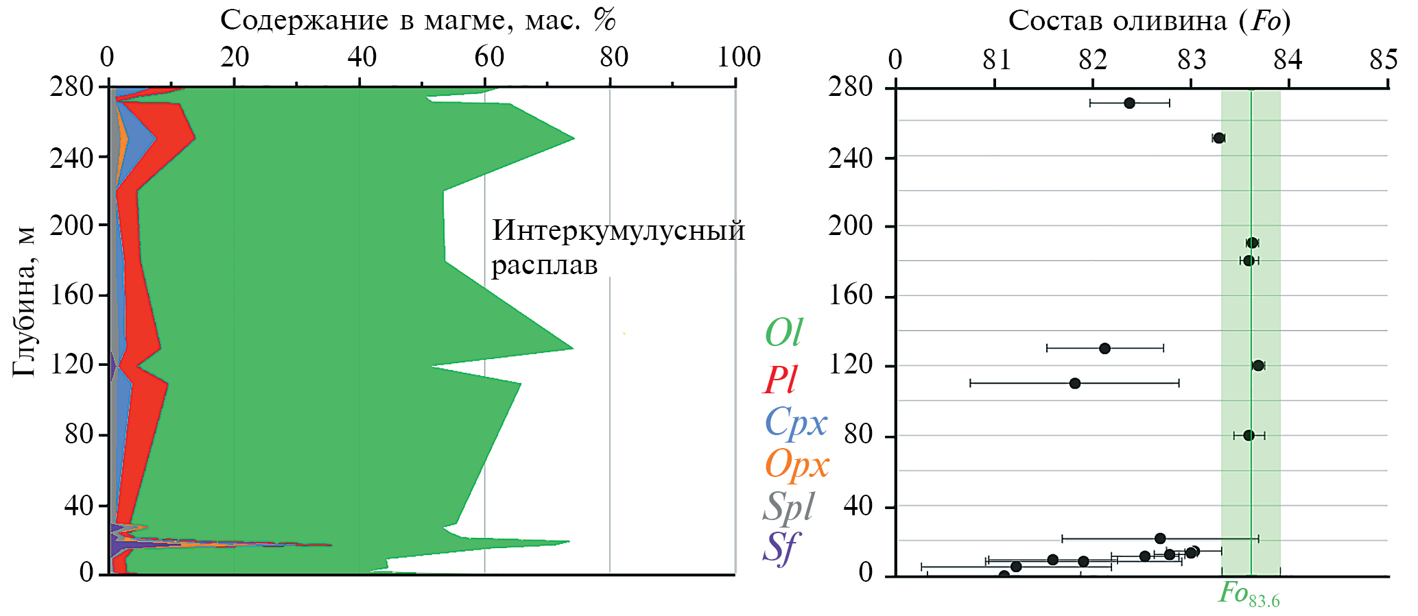 Рис. 5. Фазовые характеристики протокумулатов для рудоносных и минерализованных пород апофиза DV10 по результатам геохимической термометрии. Слева – пропорции минералов кумулуса и интеркумулусного расплава по вертикальному разрезу (средневзвешенные оценки для всего апофиза показаны в табл. 2 в колонке “Исходный расплав”). Справа – сравнение измеренных составов оливина (Пшеницын и др., 2022) с составом исходного оливина в табл. 2.