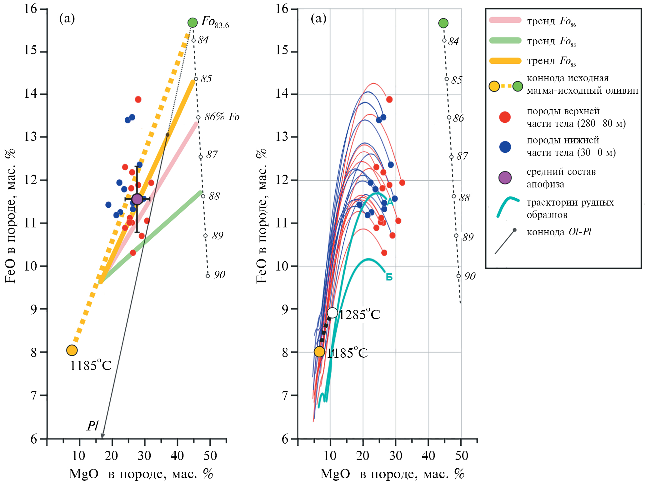 При попытках распространить подобные графические реконструкции на составы пород из габбро-перидотитовых силлов, подстилающих Йоко-Довыренский массив (см. Supplementary к Ariskin et al., 2018a), вырисовывается тренд еще более фракционированных кумулатов, но уже не оливиновых, а оливин-плагиоклазовых в равновесии с оливином, близким к Fo85 (рис. 6а).
