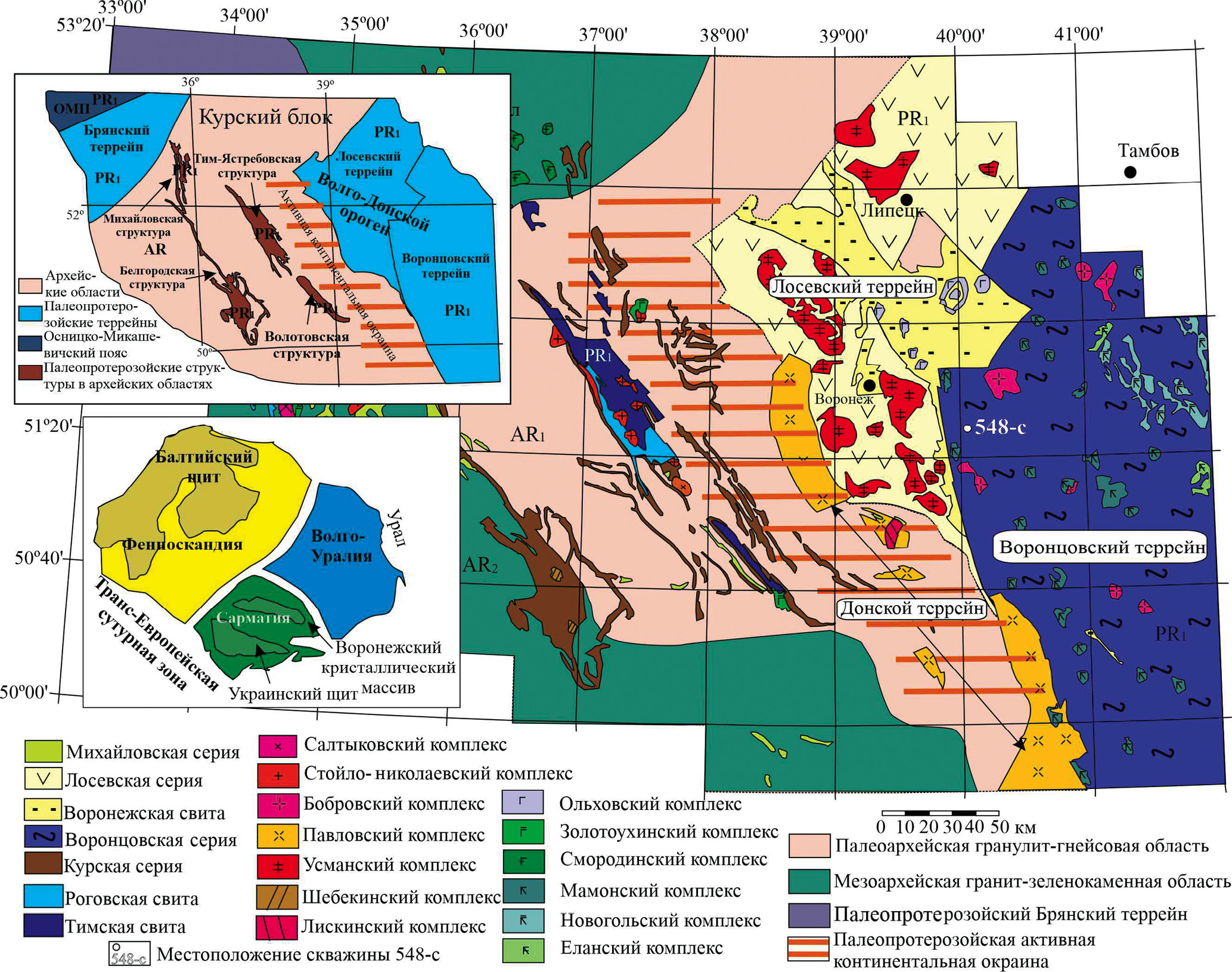 Волго-Донской ороген представляет собой обширную палеопротерозойскую субдукционно-коллизионную область, разделяющую архейские ядра Сарматского и Волгоуральского кратонов (рис. 1). Она включает Лосевский и Донской террейны, граничащие с архейским Курским блоком, обширный Воронцовский террейн и Терсинский пояс, граничащий на востоке с архейскими комплексами Волгоуралии.