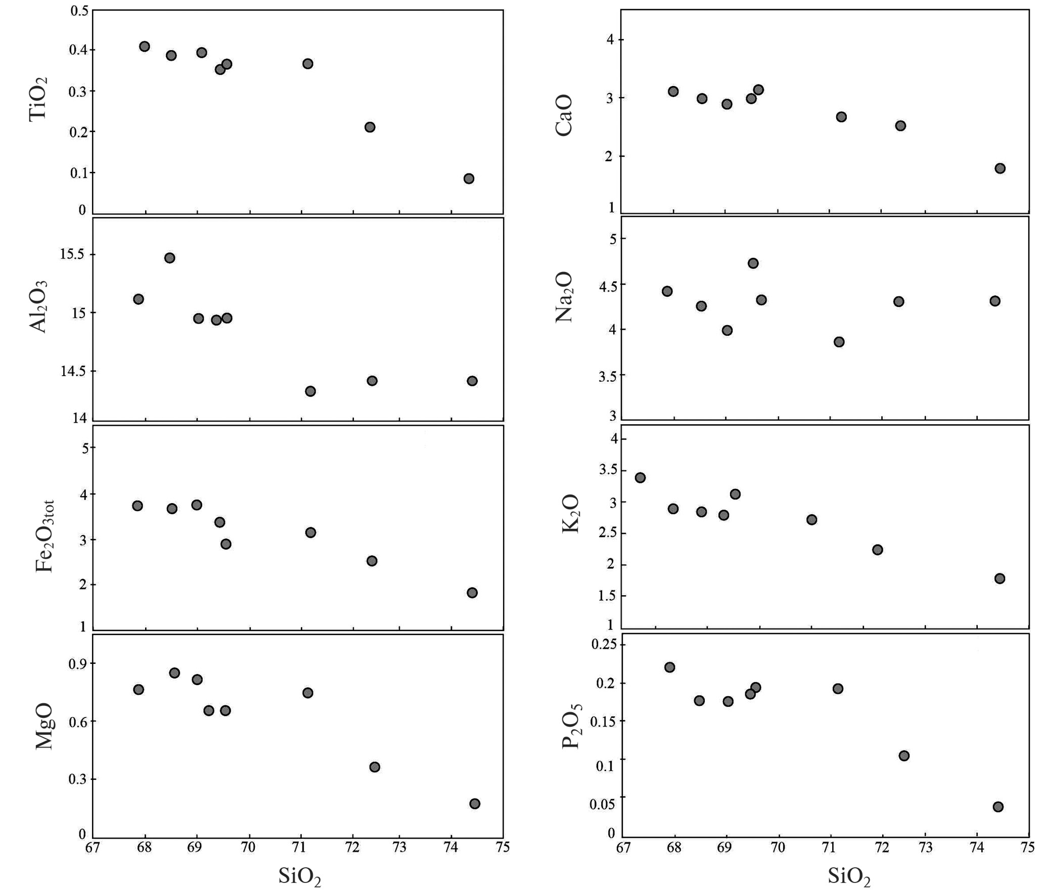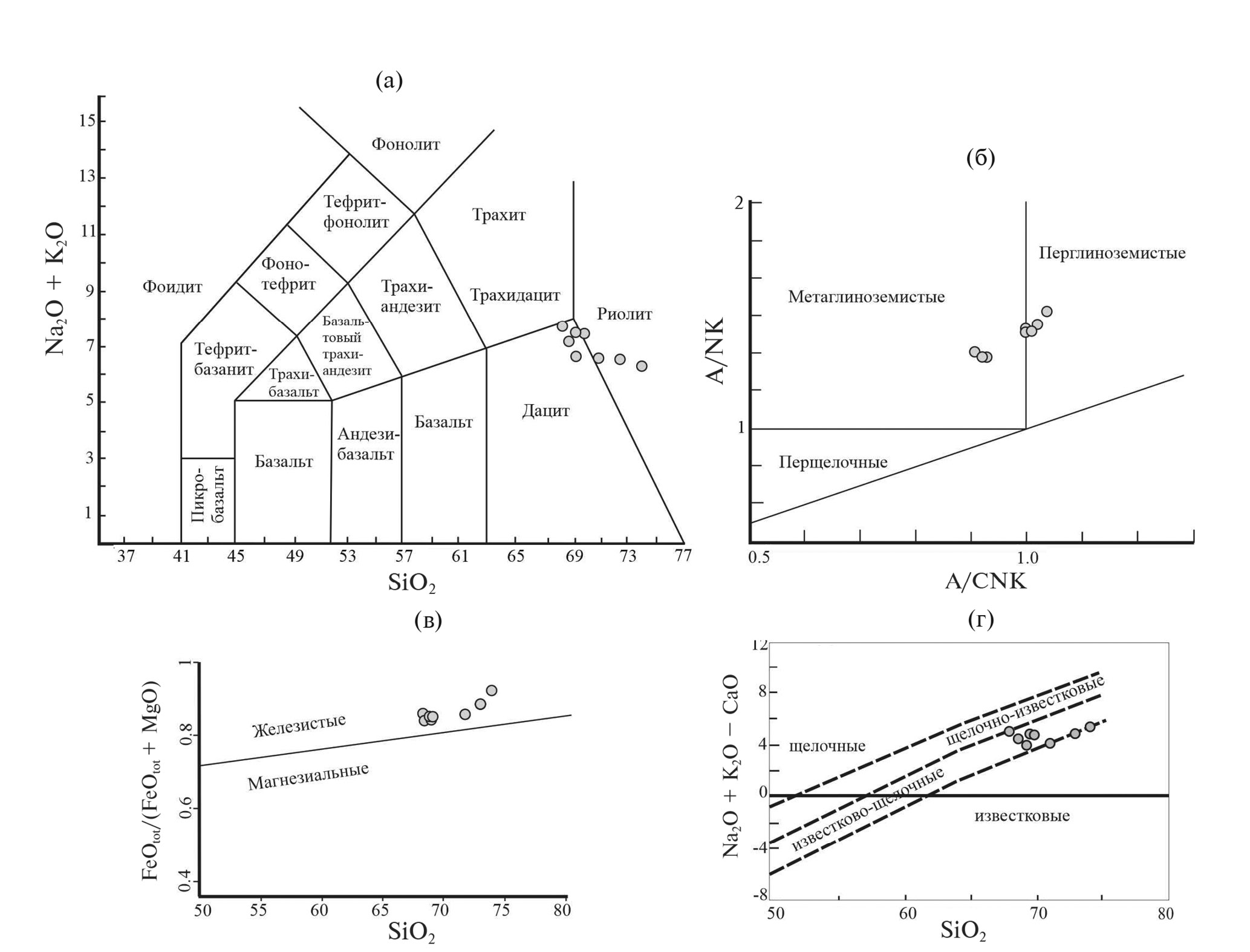 Дациты имеют содержание SiO2 от 67.9 до 74.4 мас. %, умеренную концентрацию щелочей (Na2O + K2O) = 6.3–7.8 мас. % с явным преобладанием натрия (K2O/Na2O = 0.44–0.77). Они характеризуются умеренной титанистостью (TiO2 = 0.1–0.4) и железистостью (XFe = 0.69–0.84). Глиноземистость пород близка к значениям 1.0 индекса A/CNK (рис. 3, табл. 1). На классификационной диаграмме TAS (Middlemost, 1994) точки составов попадают в поля дацитов и риолитов (рис. 3). На бинарных диаграммах отмечается отрицательная корреляция SiO2 c TiO2, CaO, Al2O3, MgO и K2O (рис. 4).
