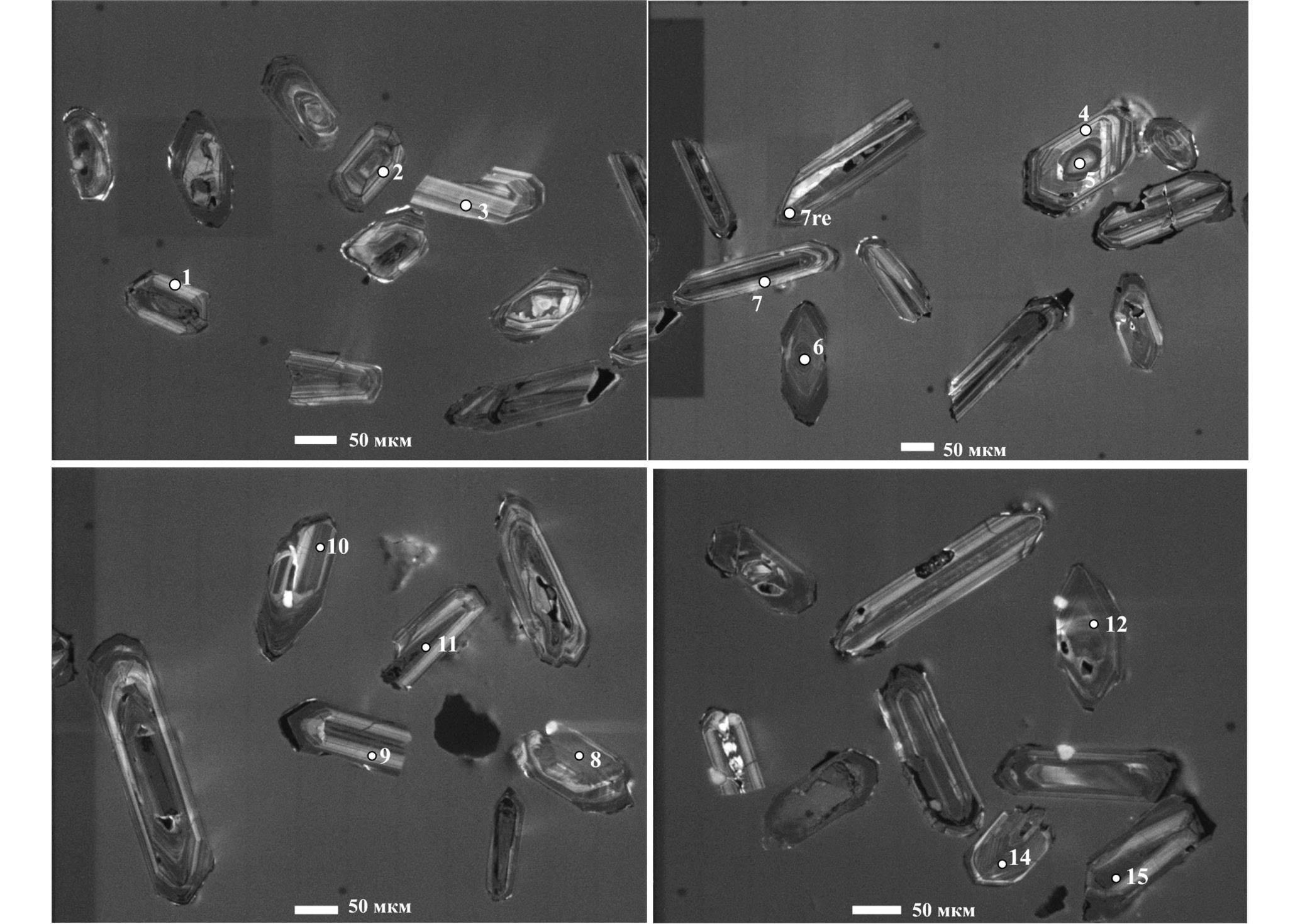 Рис. 6. Расположение точек определения возраста на КЛ-снимках цирконов из метадацитов Воронцовского террейна. Номера точек на рисунке соответствуют номерам анализов в табл. 2.