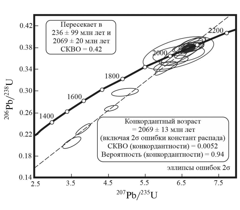 Измерения абсолютного возраста цирконов проводились на ионном микрозонде SHRIMP-II в Центре изотопных исследований Всероссийского научно-исследовательского геологического института (ЦИИ ВСЕГЕИ, г. Санкт-Петербург) по стандартной методике (Larionov et al., 2004; Williams, 1998) с использованием эталонных цирконов “91500” и “Temora”. При расчетах использовались константы распада, предложенные в работе (Steiger, Jäger, 1977), и вводилась поправка на нерадиогенный свинец по (Stacey, Kramers, 1975) на основе измеренного отношения 204Pb/206Pb. Полученные результаты обрабатывали с помощью программ “SQUID v1.12” и “ISOPLOT/Ex 3.22” (Ludwig, 2005). Поскольку результаты образовали дискордию с ненулевым нижним пересечением, оценка возраста проводилась по верхнему пересечению с конкордией. Под конкордантностью, следуя (Ludwig, 1998), понимается факт перекрытия линии конкордии эллипсом погрешностей 2σ.