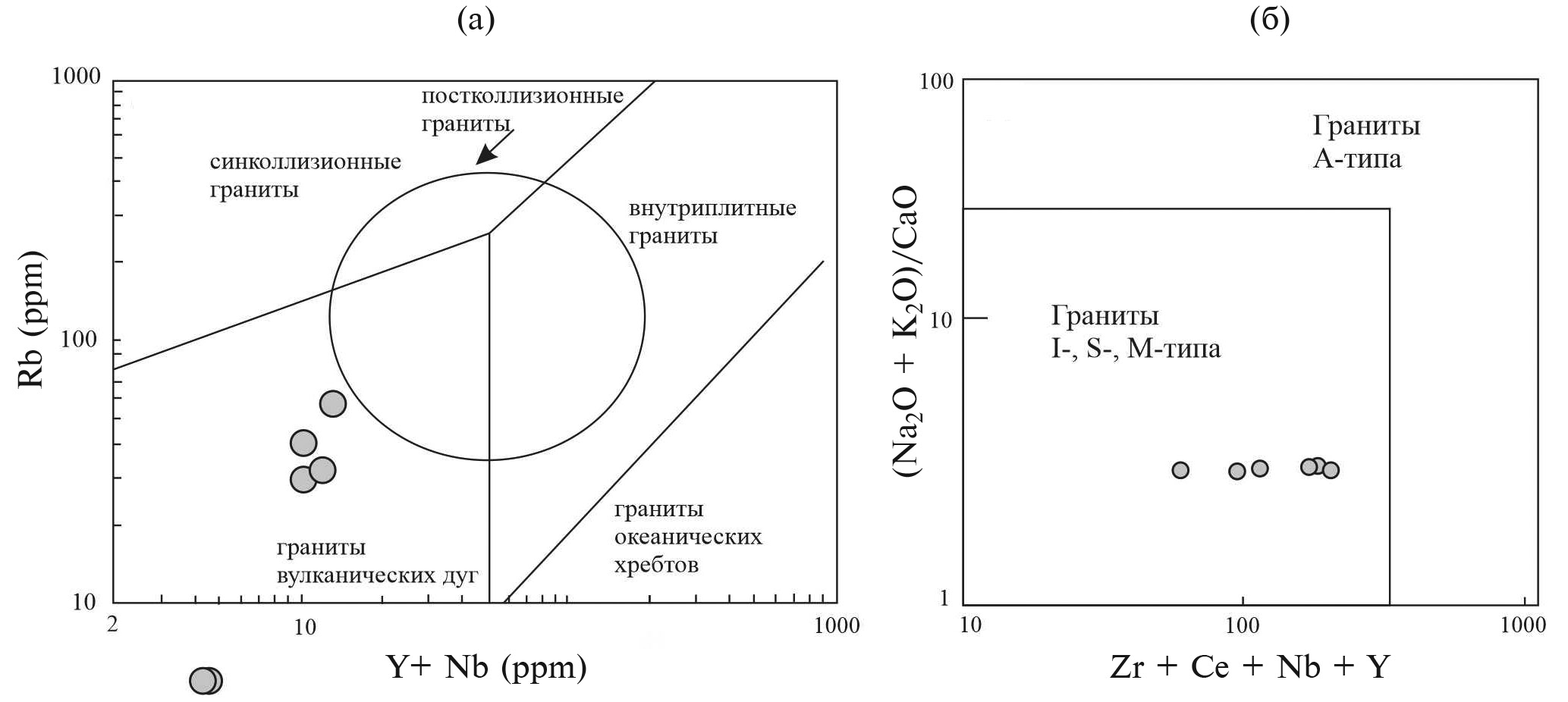 Рис. 9. Дискриминантные диаграммы для метадацитов Воронцовского террейна: (а) – по (Pearce, 1996); (б) – по (Whalen et al., 1987).