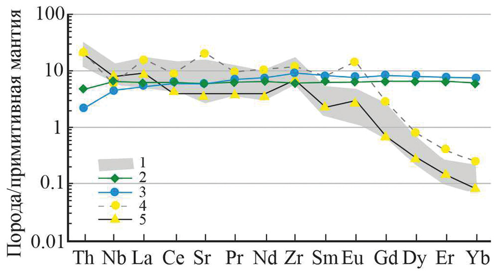 Рис. 11. Результаты моделирования процессов образования дацитов и риолитов. 1 – поле составов природных образцов; 2, 3 – предполагаемые источники расплавов: 2 – толеитовый базальт MORB-типа из нижней части разреза лосевской серии (обр. 7782/422 из Щипанский и др., 2007); 3 – средний N-MORB (White, Klein, 2014); 4 – модельный дацитовый расплав – результат 20% равновесного плавления толеитового базальта, рестит состоит из клинопироксена (50%), граната (48%) и рутила (2%); 5 – модельный риолитовый расплав – результат 30% дифференциации дацитового расплава с удалением кумулятивной ассоциации плагиоклаз (90%) + апатит (9%) + циркон (1%). Расчеты выполнены по формулам из (Arth, 1976) с использованием коэффициентов распределения из (Rollinson, Pease, 2021).